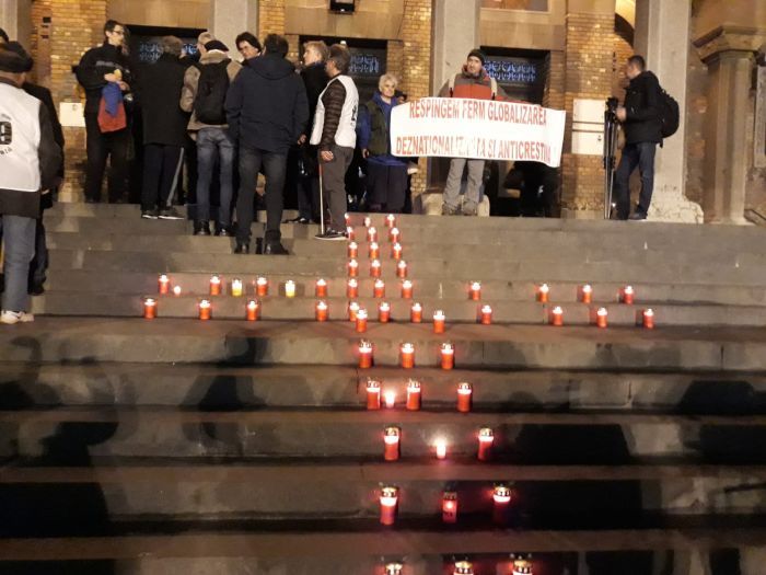 Cu drapele in maini si scandand, oamenii si-au continuat drumul, au facut un tur al Pietei Victoriei, dupa care s-au oprit în fata Catedralei Mitropolitane. Aici au fost intampinati de mitropolitul Banatului, Ioan Selejan si impreuna au spus rugaciunea Tatal Nostru. Apoi, un cor a cantat colinde, iar in final, au fost depuse candele aprinse pe scari, in semn de omagiu pentru cei cazuti in Decembrie 1989.