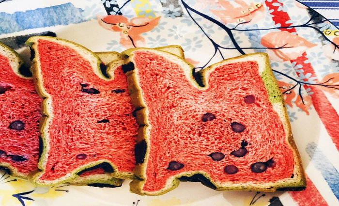 Culorile painii vin din pudra de ceai verde, colorant rosu si capsuni, iar „semintele” de pepene sunt, de fapt, bucati de bambus comestibil.
