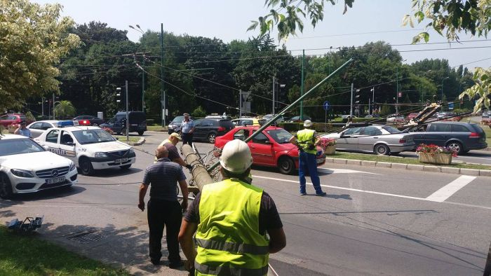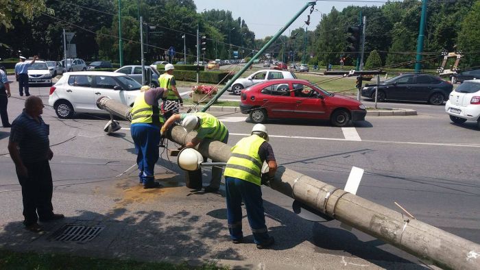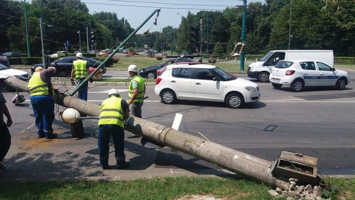 TIMISOARA. Panica pe unul dintre cele mai circulate bulevarde din Timisoara. Un stalp de iluminat public, aflat pe marginea strazii s-a prabusit in drum, pe prima banda de trafic, tragand dupa el si mai multe fire.