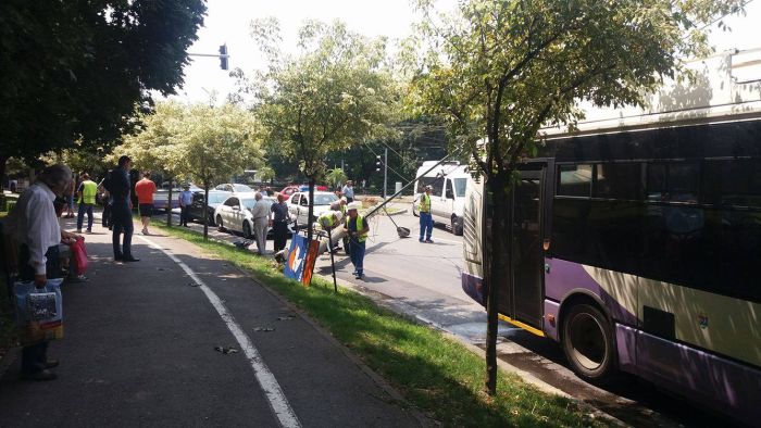 De vina a fost un troleibuz al RATT care venea dinspre Modex. In timpul incadrarii in sensul giratoriu, o clema de la coarnele care asigura contactul cu liniile de curent s-a desprins, iar unul din brate a agatat un cablu aflat la inaltime. Astfel, acesta a tras dupa el si stalpul de care era prins si care a cazut cu zgomot in drum.