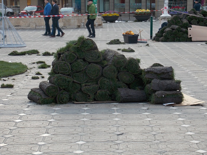 Pana la deschiderea oficiala a Festivalului Florilor din aceasta primavara de la Timisoara, angajatii de la Horticultura si nu numai trudesc de zor la amenajarea mai multor decoratiuni si au adus pana si role de gazon pe platoul din Piata Operei.