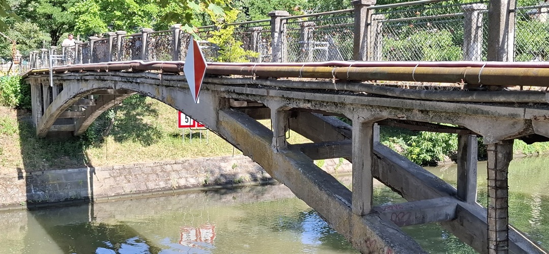 Pasarela actuală, construită în 1949, se află într-o stare avansată de degradare, având infiltrații la nivelul structurii de rezistență.