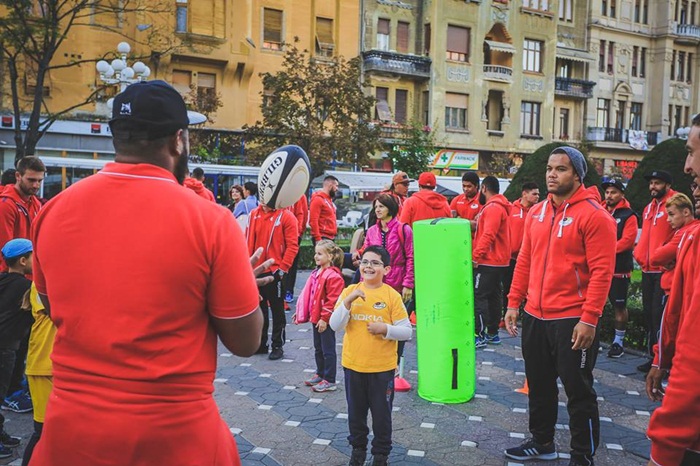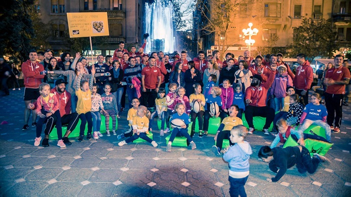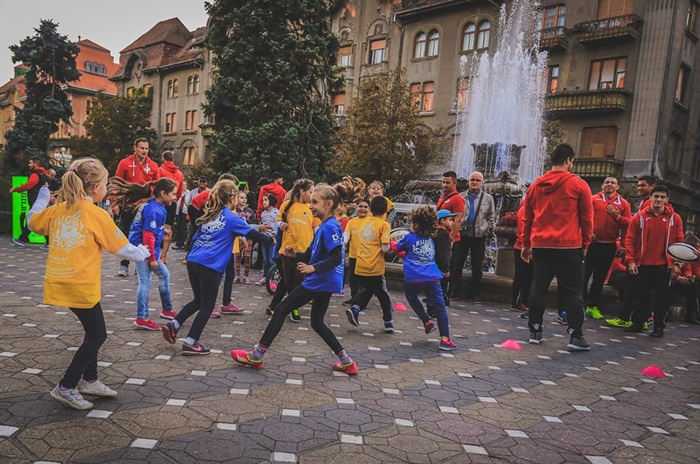 TIMISOARA. Campionii Romaniei la rugby au iesit in centrul Timisoarei in ultima zi din saptamana mobilitatii. Alaturi de campioni au fost prezenti si piticii din cadrul programului rugby4schools.