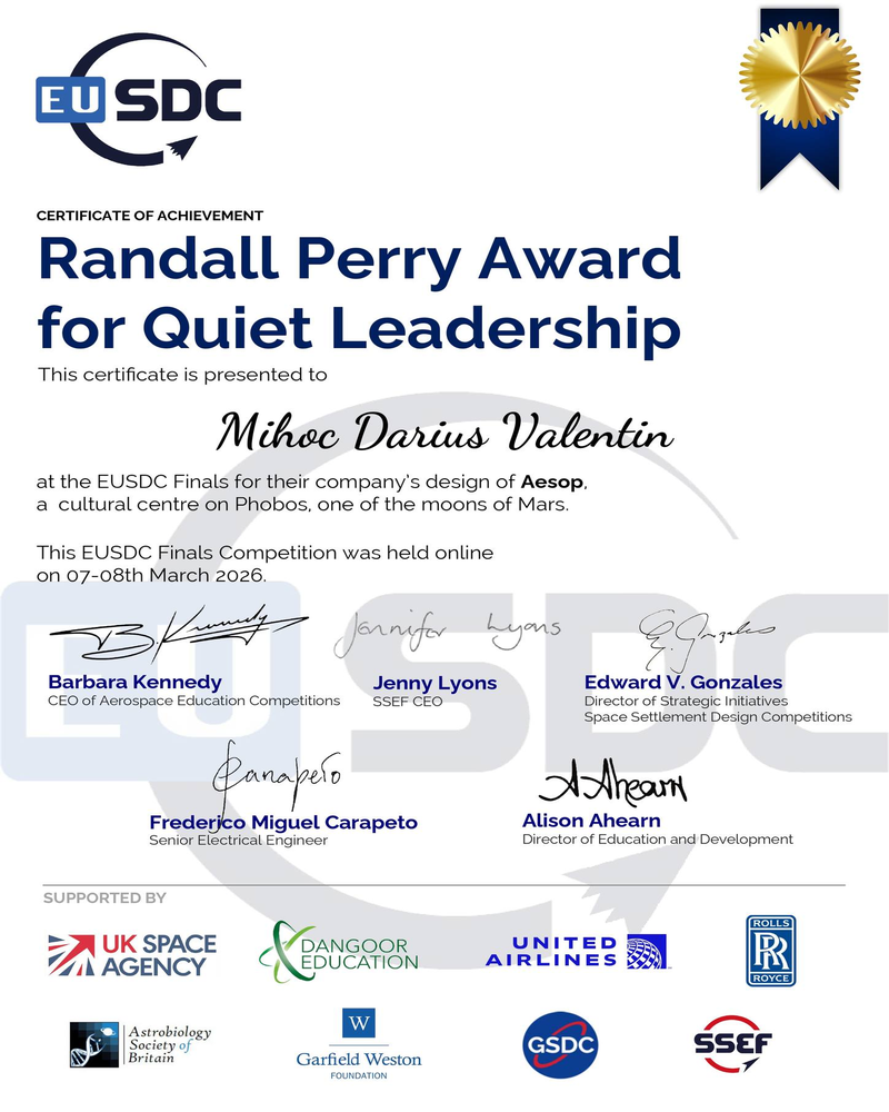 Darius Mihoc, din clasa a XI-a MI1, va reprezenta Colegiul Național Bănățean, România și Europa la finala internațională a concursului de proiectare aerospațială International Space Settlement Design Competition (ISSDC).