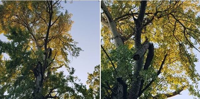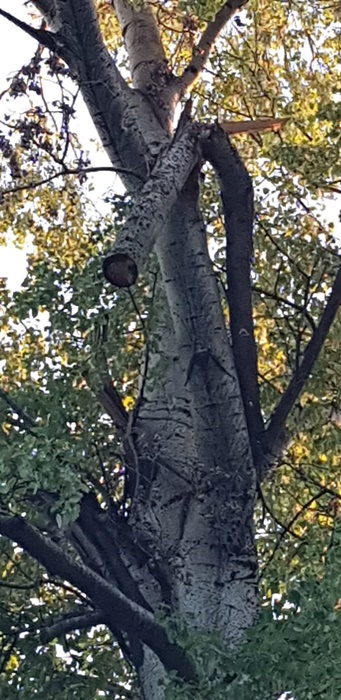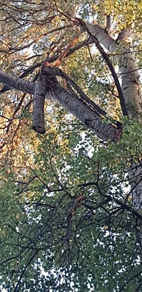 O creanga groasa rupta dintr-un copac care se mai tine doar intr-o bucata de coaja se poate prabusi in orice moment in capul cuiva.