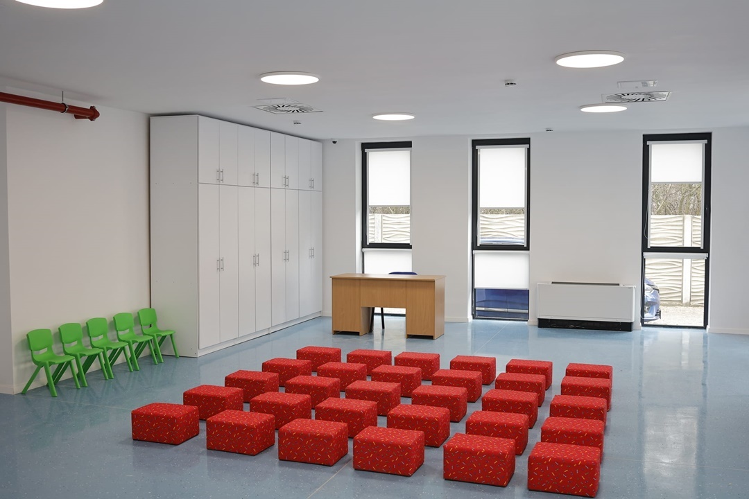 Clădirea cu fațadă multicoloră include săli de joacă moderne, dormitoare spațioase, o bucătărie complet utilată, spălătorie proprie, sală festivă pentru evenimente, cabinet medical, spații administrative moderne și un teren de joacă generos în aer liber.