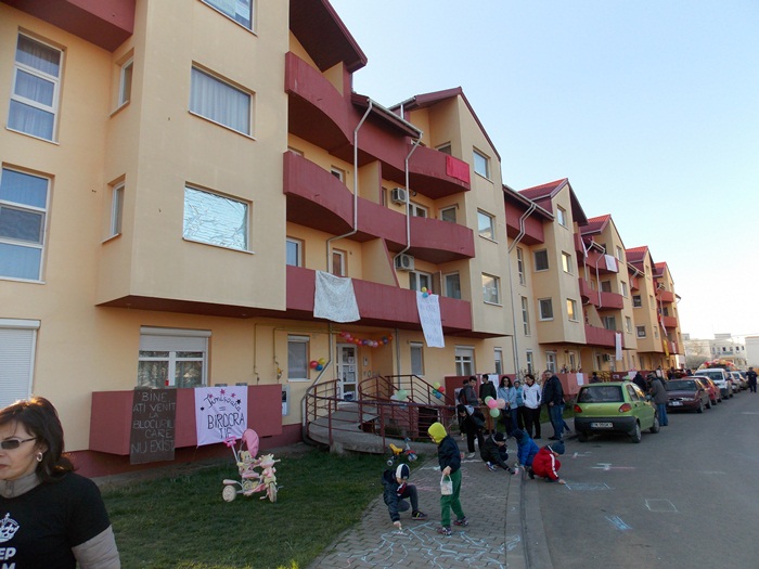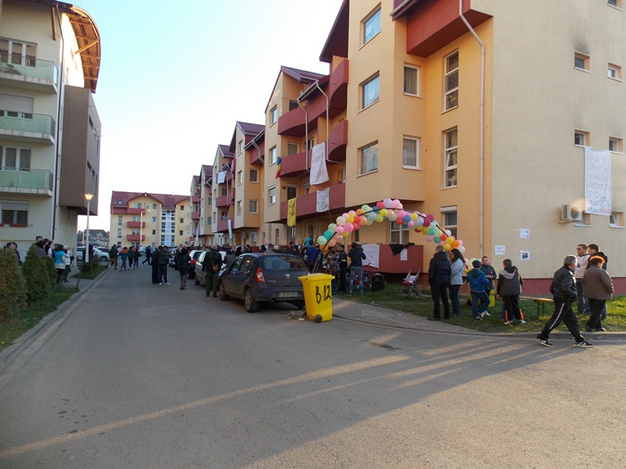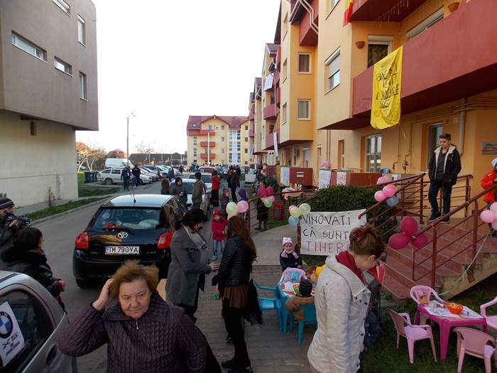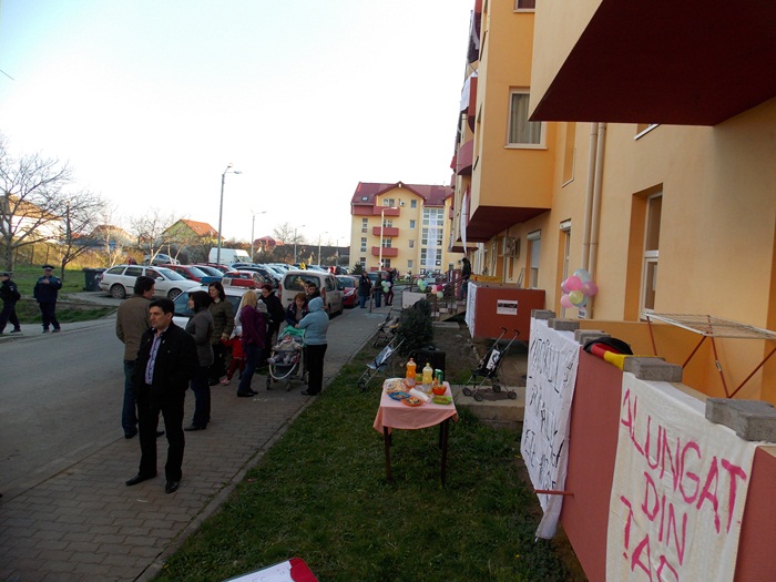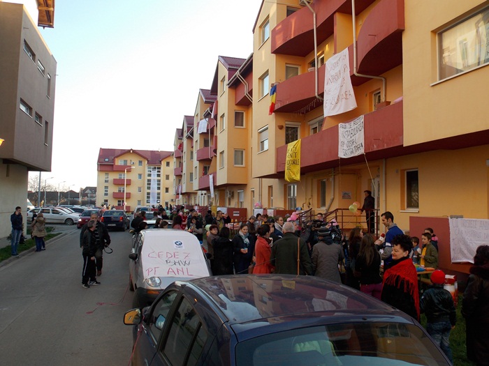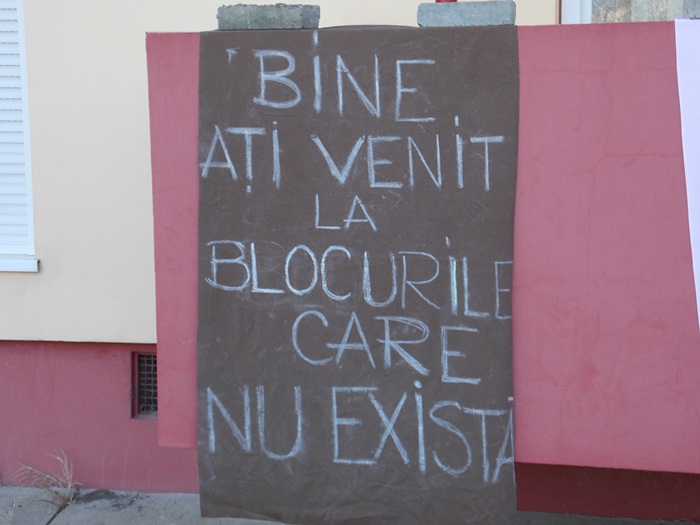Daca un strain de oras ar fi venit dinspre strada Mures catre blocurile ANL de pe Miloia, ar fi crezut ca nimereste la o ruga banateana, nu la un protest al unor cetateni nemultumiti. Pe unul dintre blocuile ANL neintabulate trona o urare scrisa pe o panza alba:”Bine ati venit la blocurile care nu exista“, iar pe fundal se putea auzi celebra piesa populara “Doamne, ocroteste-i pe romani“.