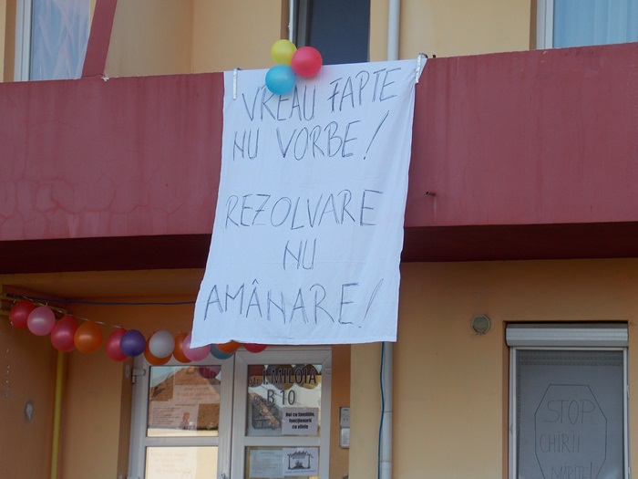 A fost doar primul banner dintre cele pe care timisorenii din aceste blocuri si-au aratat nemultumirea fata de situatia in care se gasesc si care considera ca municipalitatea este vinovata. Timisorenii cer intabularea cladirilor pentru a putea achizitiona apartamentele, mai ales dupa ce chiria a crescut de la 57 de lei pentru un apartament cu doua camere, la 660 de lei, pentru cei care au depasit varsta de 35 de ani. In lunile de iarna, oamenii care stau cu chirie in locuintele sociale ajung sa plateasca si 1500 de lei pe luna, chirie + cheltuieli.