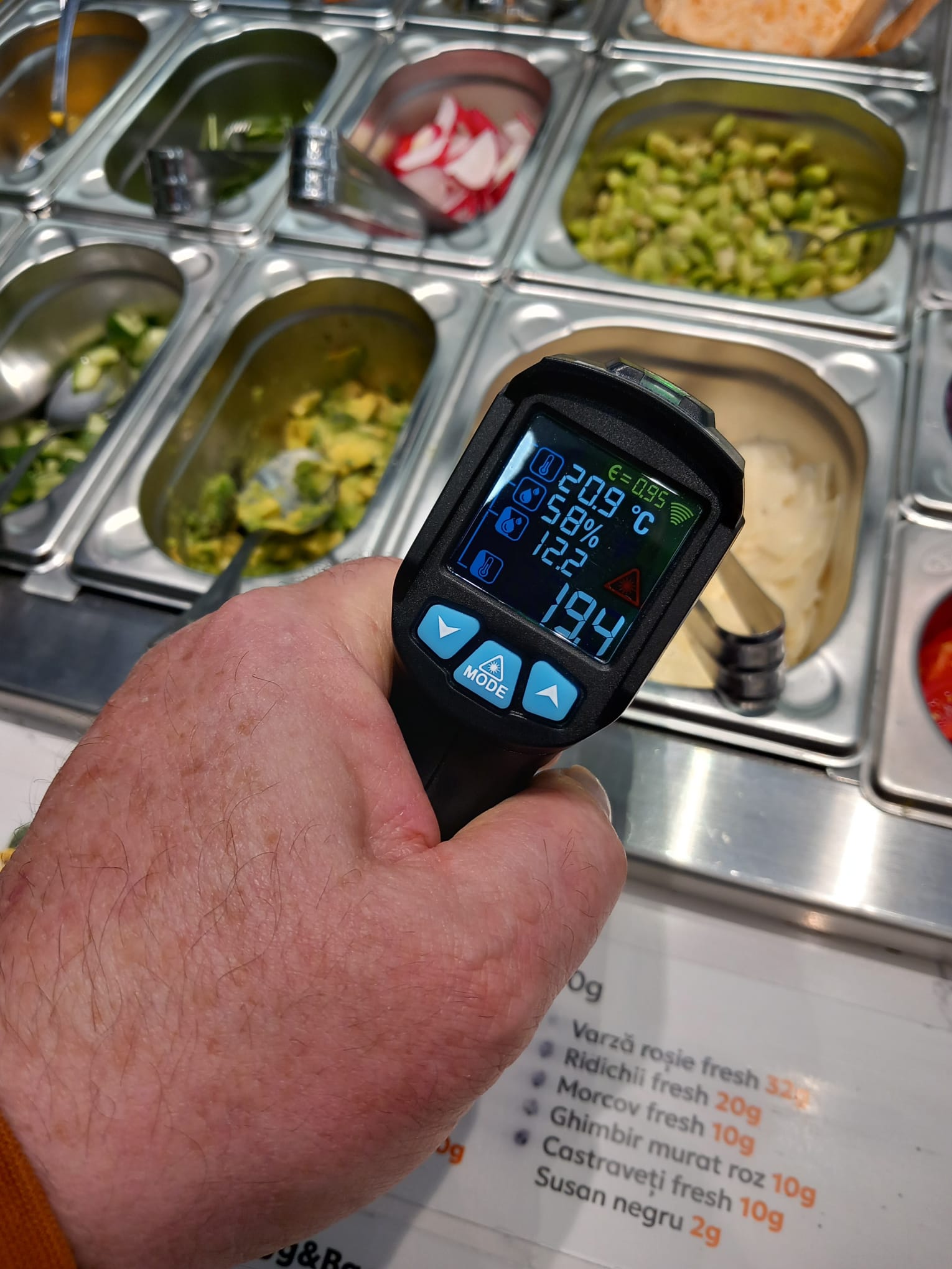 Romanian Food Mall Calea Sagului – sosuri păstrate la temperaturi mai mari de 8 grade C, frigider cu cheder rupt, cuțite neprofesionale. A fost aplicată o sancțiune de 8.000 lei și măsura de oprire definitiva de la comercializare și retragerea din circuitul consumului uman la produsele alimentare.