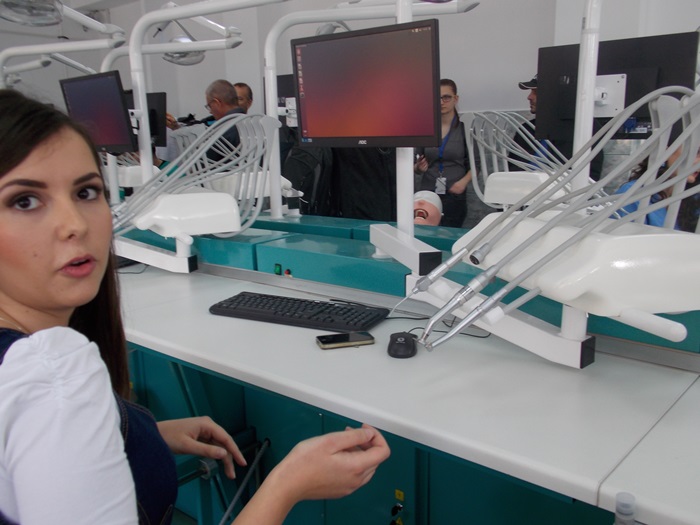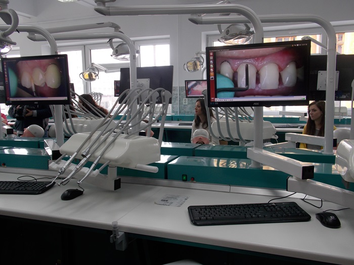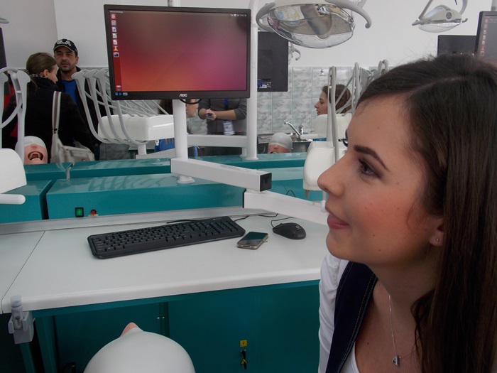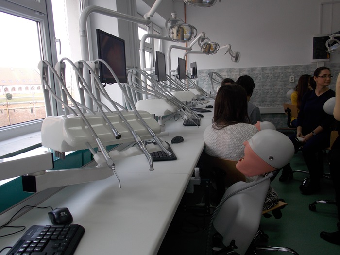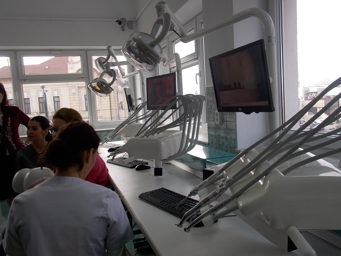 “Sunt 24 de posturi de lucru cu simulator, cu 24 de calculatoare-monitoare, piese de mana, sistem de aspiratie si drenaj care simuleaza aproape perfect situatia de lucru pe un pacient. Nicio alta facultate din Romania nu are un laborator de o asemenea si dotare, care sa permita lucrul cu 3 grupe simultan si sa aduca legat in reteaua de internet a facultatii mai multe discipline si informatii din mai multe departamente intr-un singur laborator. Pentru studenti beneficiul este faptul ca invata manoperele de medicina dentara la o precizie si o calitate net superioara fata de ce se intampla in trecut”, a spus medicul Emanuel Bratu, profesor in cadrul Facultatii de Stomatologie.