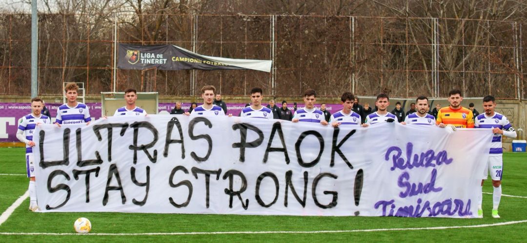 Oaspeții au deschis scorul încă din minutul 22 al întâlnirii de pe sinteticul Bazei 2 Politehnica, prin Puta. Cinci minute mai tîrziu, meciul a fost întrerupt, iar fotbaliștii alb-violeți au ținut un moment de reculegere în memoria fanilor lui PAOK Salonic decedați în teribilul accident din 27 ianuarie de la Lugojel. jucătorii au afișat un banner cu un mesaj al Peluzei Sud.