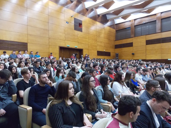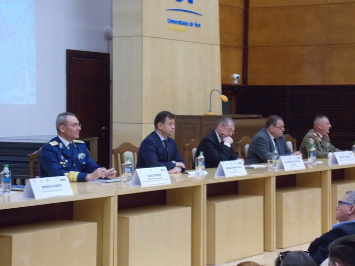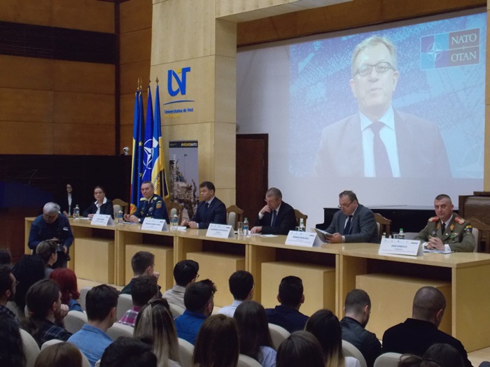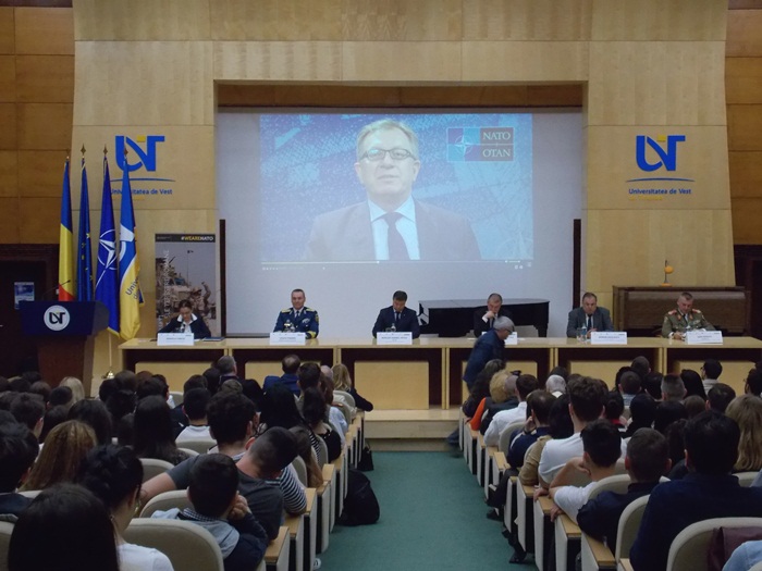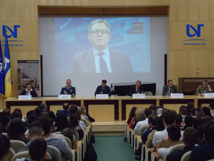 TIMISOARA. Aula Magna a Universitatii de Vest din Timisoara a fost plina de studenti la conferinta “Romania in NATO – 14 ani”.
