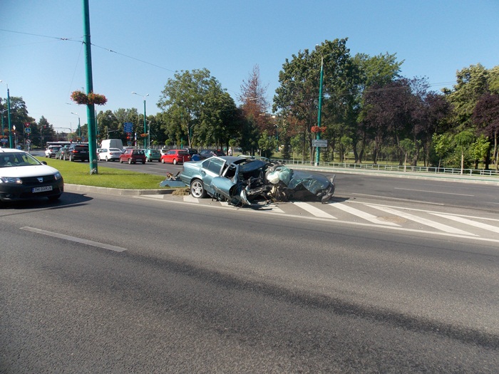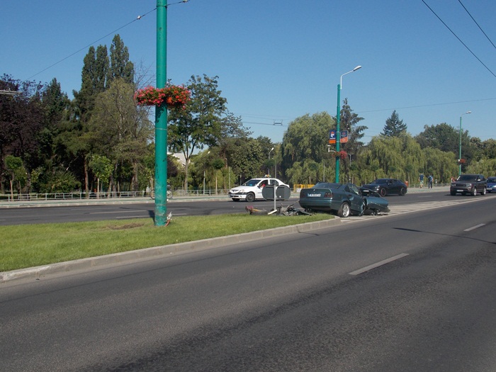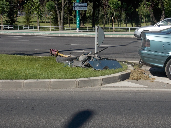 Din pricina vitezei, tanarul n-a mai putut redresa bolidul care a izbit violent un stalp. Partea din fata a masinii a fost pur si simplu spulberata, iar unul dintre cauciucuri a zburat la cativa metri departare.