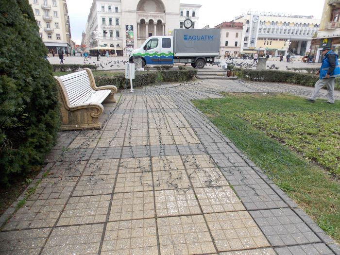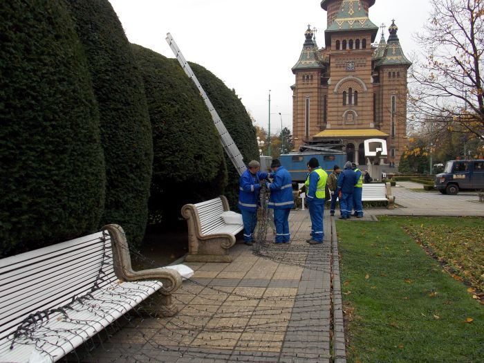 TIMISOARA. Firmele din subordinea Primariei au inceput montarea luminitelor care vor impodobi centrul Timisoarei pe perioada sarbatorilor de iarna.