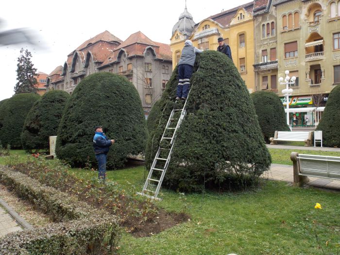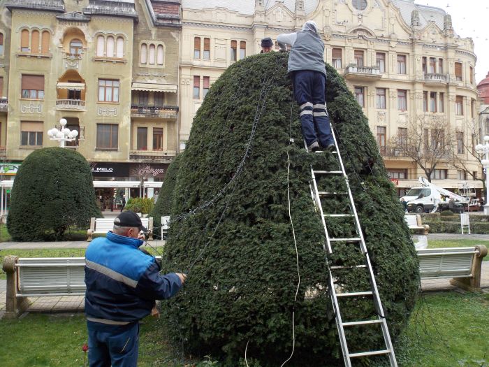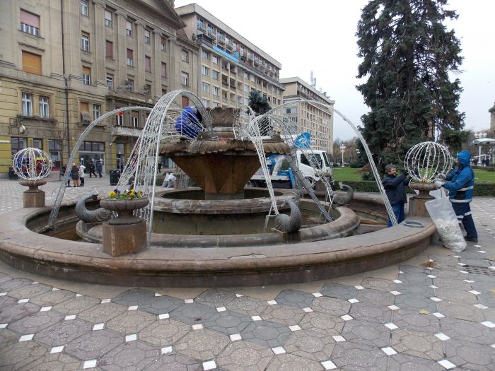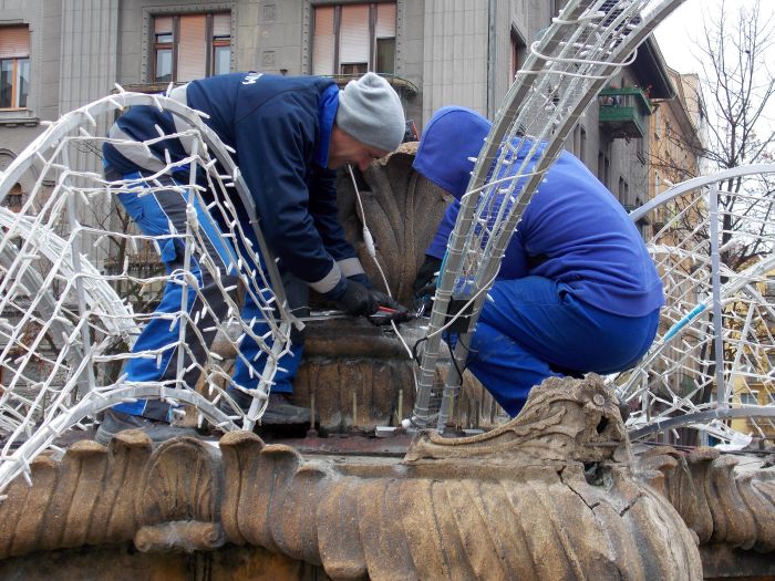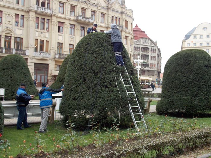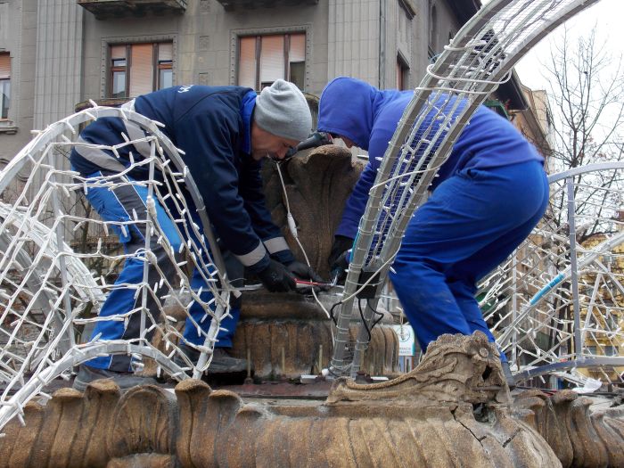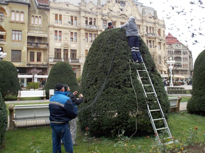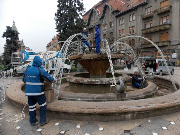 Angajati ai Aquatim, RATT si SDM au inceput instalarea miilor de beculete pe brazi, dar si pe Fantana cu Pesti, care va fi iluminata altfel in acest an.