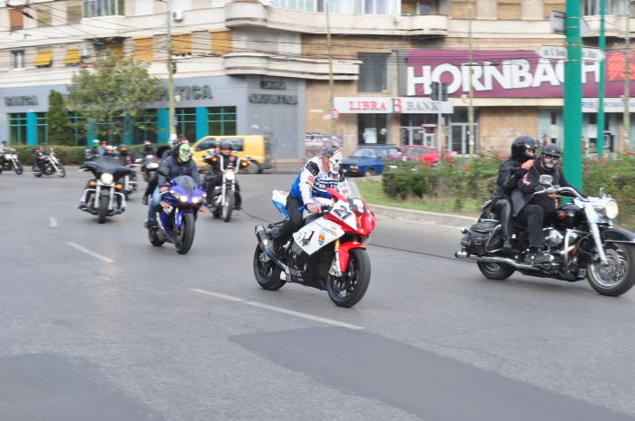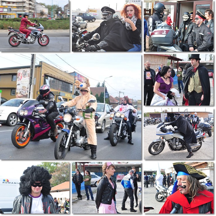 Zeci de bikeri din Timisoara, Resita si Arad s-au urcat pe motociclete si au pornit in prima parada pe motoare din tara, pe strazile Timisoarei. Costumati in personaje din filme, mineri, pirati, asistente, vrajitoare, preoti sau magicieni, motociclistii banateni au vrut sa le arate timisorenilor cat de importanta este comunitatea moto din oras. Au pornit pe un traseu prestabilit de pe strada Divizie 9 Cavalerie, prin fata Catedralei Mitropolitane si inapoi spre locul de intalnire.
