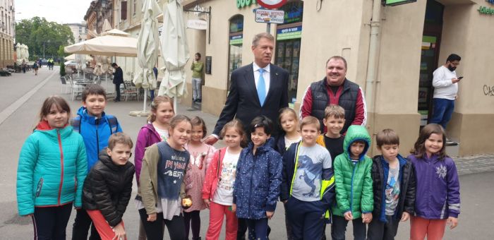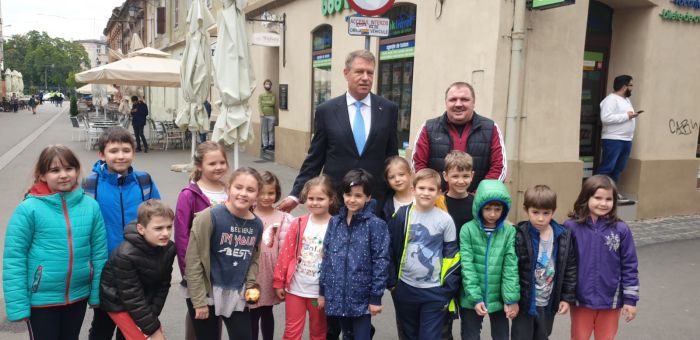 Inainte, s-a intalnit si cu un grup de copii de la liceul cu predare in limba germana Nikolaus Lenau din Timisoara. Pustii se aflau in trecere acolo in drum spre un parc, au intrat in vorba cu presedintele si au facut o adevarata sedinta foto cu Klaus Iohannis.