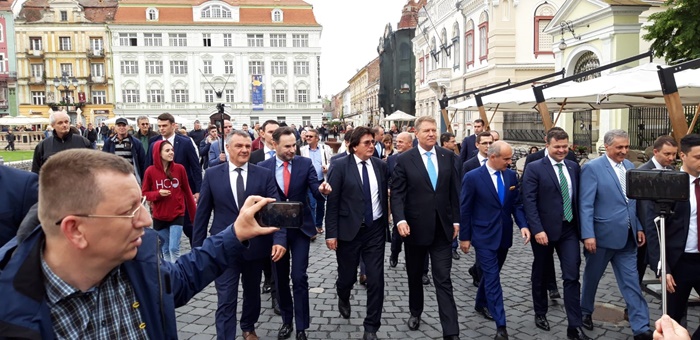 In cea mai frumoasa piata din Timisoara a urmat o sedinta foto, apoi Klaus Iohannis s-a indreptat spre Palatul Baroc, unde a fost intampinat de mai multi liberali.