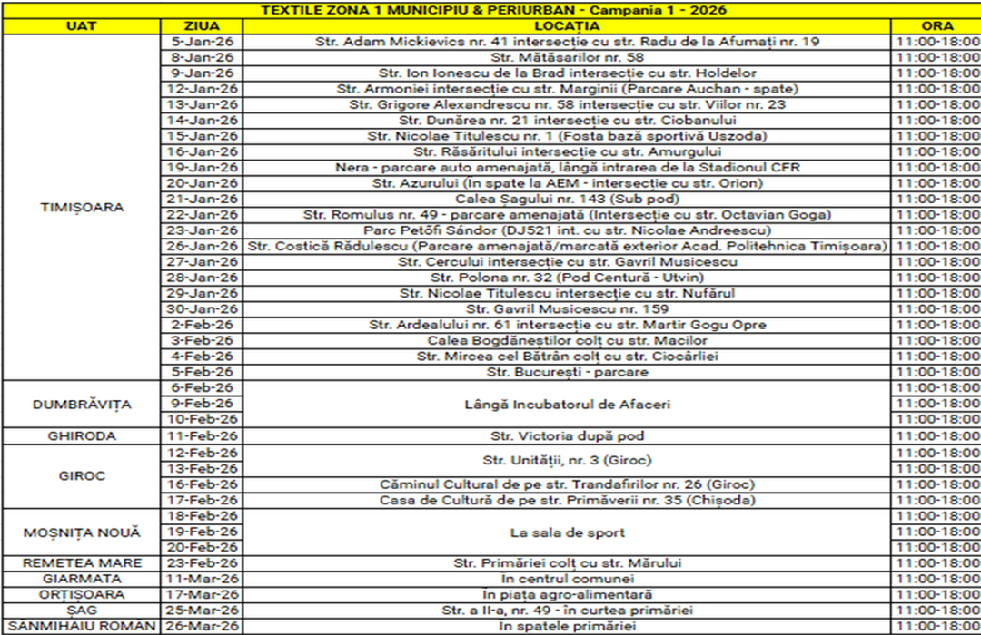 TIMISOARA. RETIM Ecologic Service S.A., în parteneriat cu ADID Timiș, anunță o nouă campanie trimestrială pentru predarea gratuită a deșeurilor textile, în Zona 1 Timișoara, jud. Timiș. Utilizatorii casnici se pot debarasa legal și GRATUIT de deșeurile textile din gospodărie. Campania se desfășoară în perioada 05 ianuarie – 31 martie 2026, în localitățile: Timișoara, Dumbrăvița, Ghiroda, Giroc, Moșnița Nouă, Remetea Mare, Sânandrei, Șandra, Becicherecu Mic, Biled, Bucovăț, Cărpiniș, Cenei, Checea, Dudeștii Noi, Fibiș, Foeni, Giarmata, Giulvăz, Iecea Mare, Mașloc, Orțișoara, Otelec (și în Iohanisfeld), Parța, Peciu Nou, Pișchia, Săcălaz, Șag, Sânmihaiu Român, Satchinez, Uivar și Variaș.