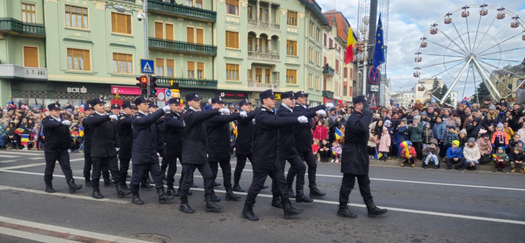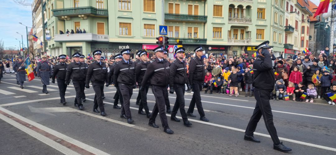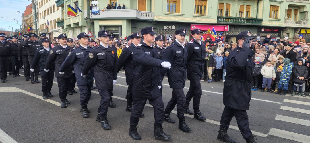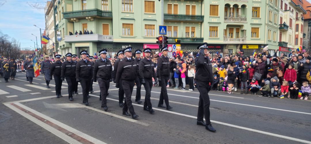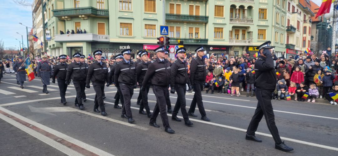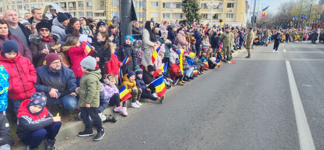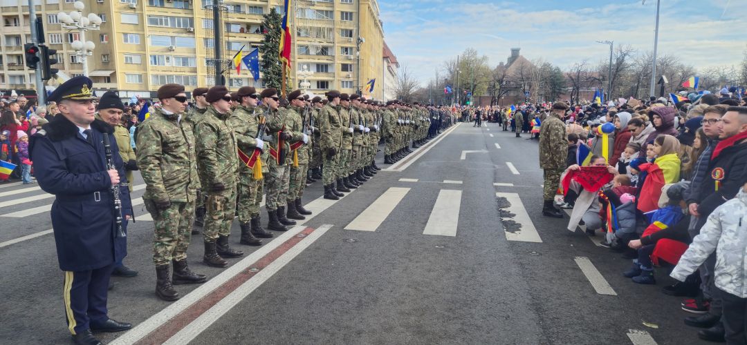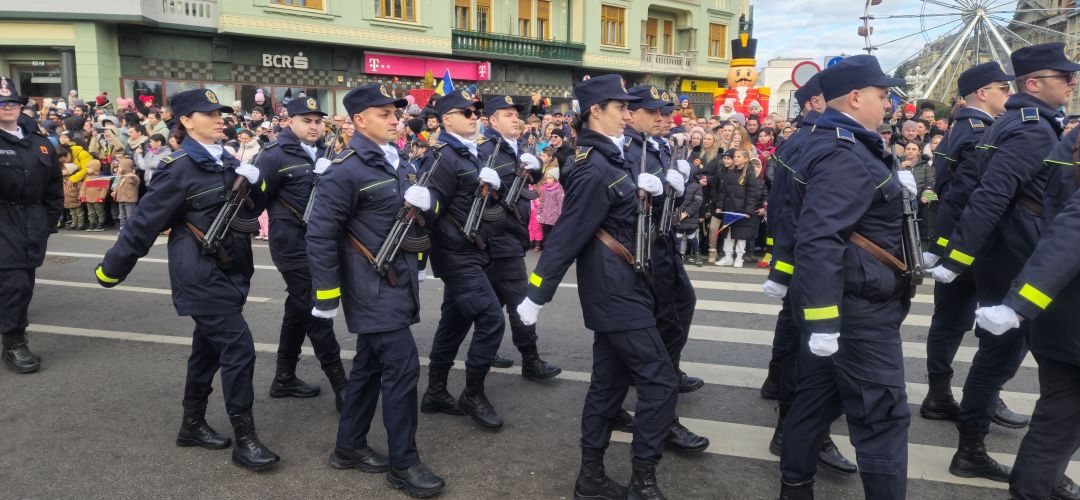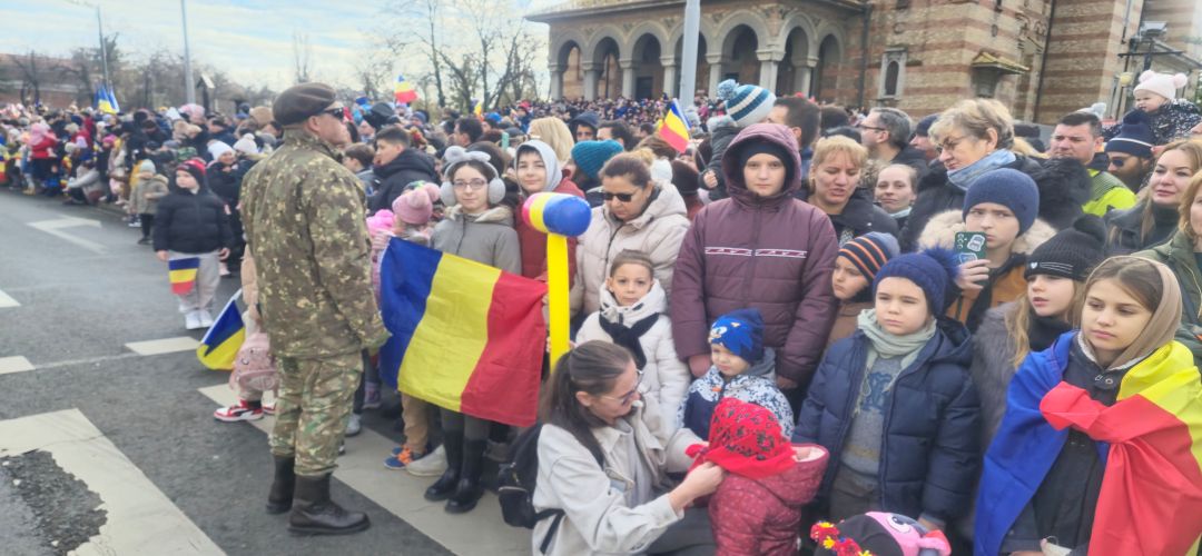 Cu mic cu mare, purtand steaguri tricolore in maini, timisorenii s-au insirat de-a lungul bulevardului din fata Catedralei Mitropolitane sa priveasca parada la care au luat parte 3 plutoane de militari, jandarmi, politisti locali, pompieri si politisti de penitenciar.