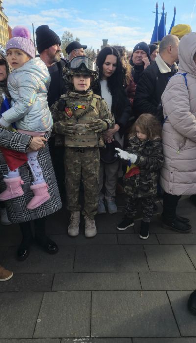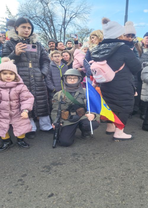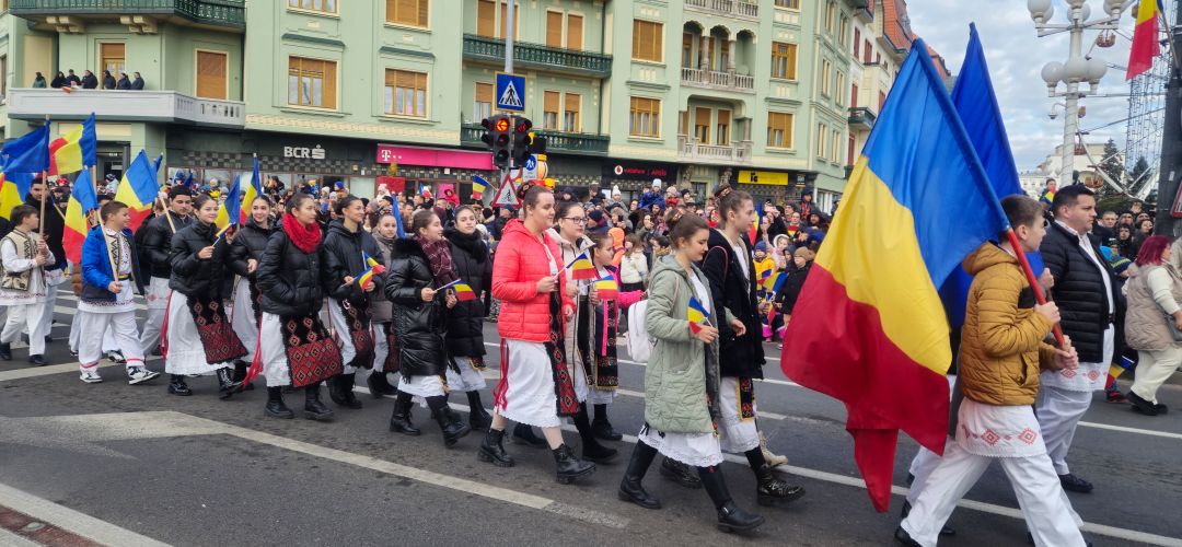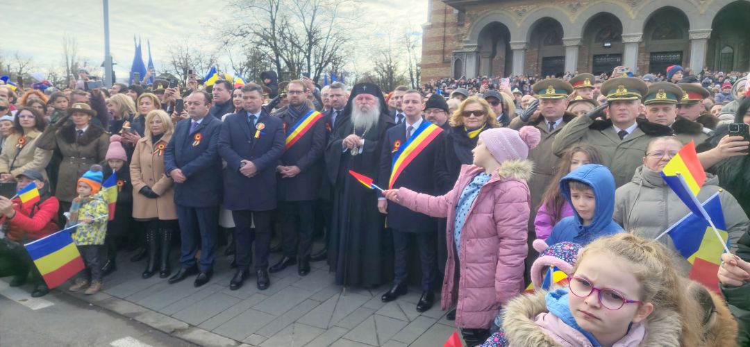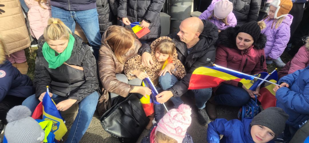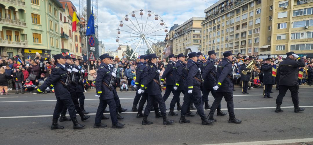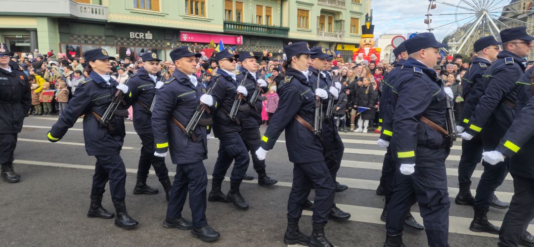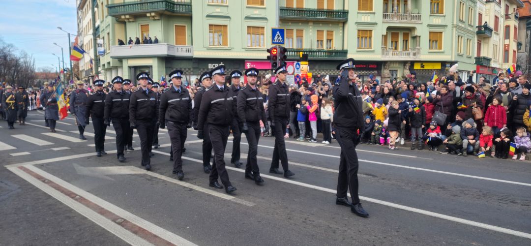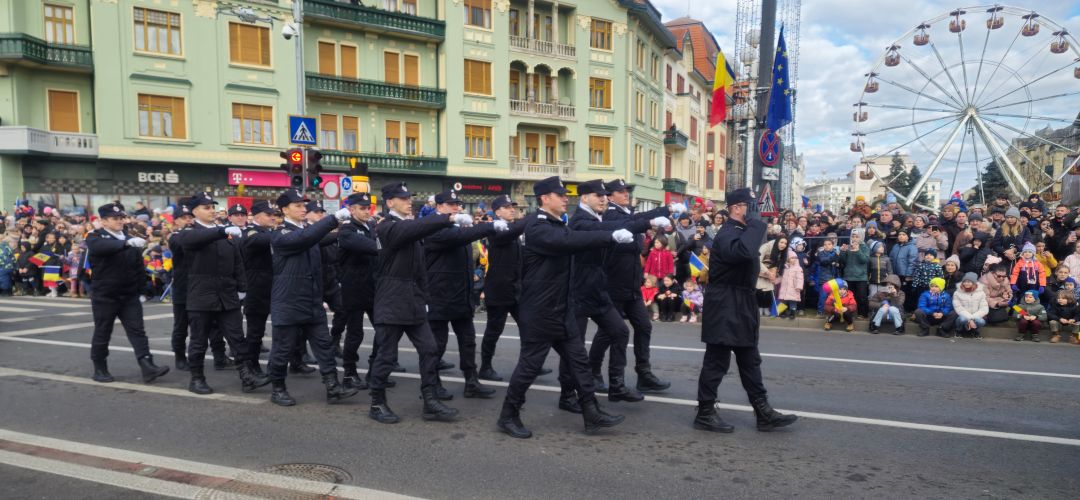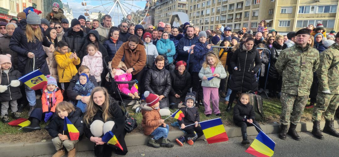 Cu mic cu mare, purtand steaguri tricolore in maini, timisorenii s-au insirat de-a lungul bulevardului din fata Catedralei Mitropolitane sa priveasca parada la care au luat parte 3 plutoane de militari, jandarmi, politisti locali, pompieri si politisti de penitenciar.