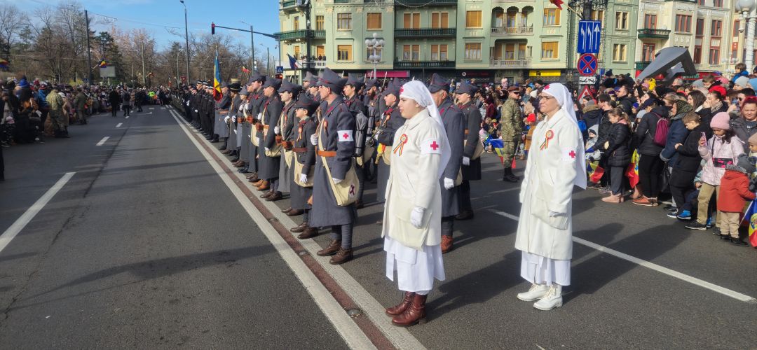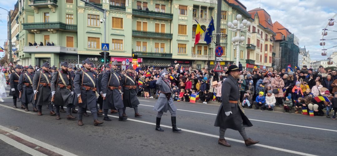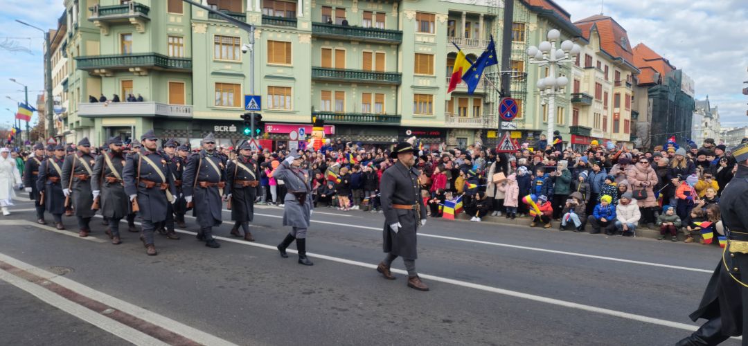 Alaturi de militari si fortele de ordine, la parada au luat parte si membrii Asociatiei de Reconstituiri Istorice, acei voluntari care aproape in fiecare duminica asigura schimbul de garda in Cetatea Timisoarei. De 1 Decembrie, acestia au purtat echipamentul soldatilor romani din Primul Razboi Mondial si au fost condusi simbolic de ‘generalul Virgil Economu’, cel care s-a aflat in fruntea trupelor romanesti care au intrat in Timisoara in 1919.