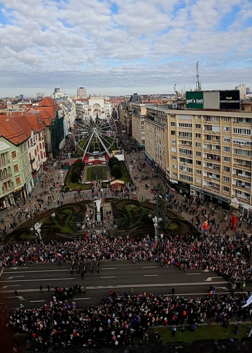 TIMISOARA. Atmosfera de sarbatoare la Timisoara, unde in centrul orasului mii de oameni s-au adunat sa urmareasca parada militara restransa de Ziua Nationala a Romaniei.