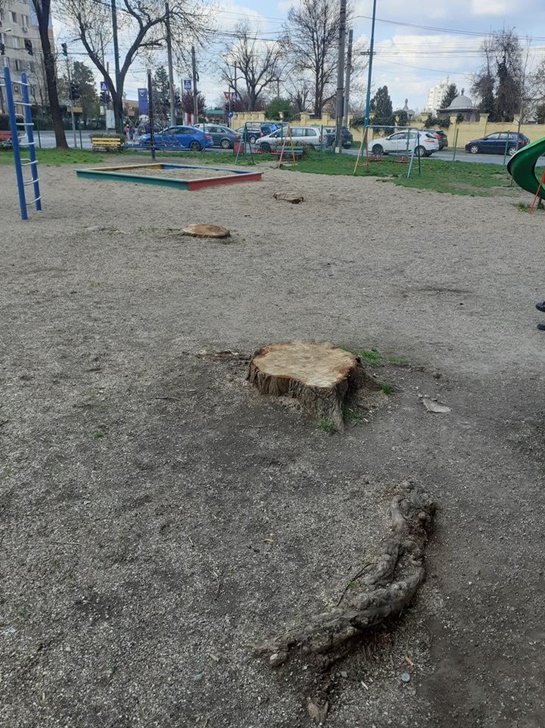 Mai multi copaci au fost taiati de reprezentantii primariei in parcul de langa Cimitirul Eroilor, din zona Lipovei, insa muncitorii au lasat in urma cioturi de care cei mici se pot impiedica si se pot produce accidente, mai ales ca locul de joaca este prevazut cu pietris amestecat cu nisip.