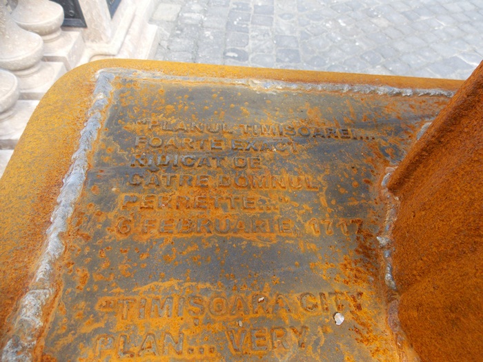 Sculptura este facuta dupa “planul Timisoarei foarte exact ridicat de catre domnul Perrette“, asa cum scrie si pe postament. Planul capitanului Perrette a fost intocmit in 6 februarie 1717. Pe acelasi piedestal, langa macheta cetatii se afla si o reprezentare a rozei vanturilor.