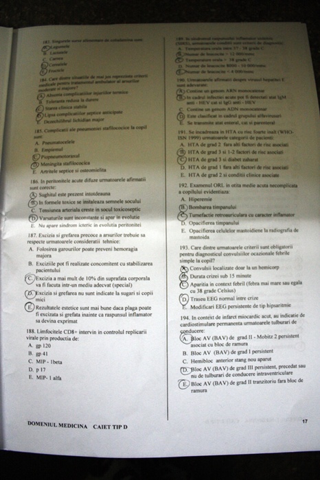 Tinerii au avut de completat un chestionar tip grila cu nu mai putin de 200 de intrebari, fiecare cu mai multe variante de raspuns. Ca o noutate fata de ceilalti ani, subiectele au fost concepute diferit, pentru fiecare centru de examinare in parte (Timisoara, Bucuresti, Targu Mures, Craiova, Cluj-Napoca si Iasi).