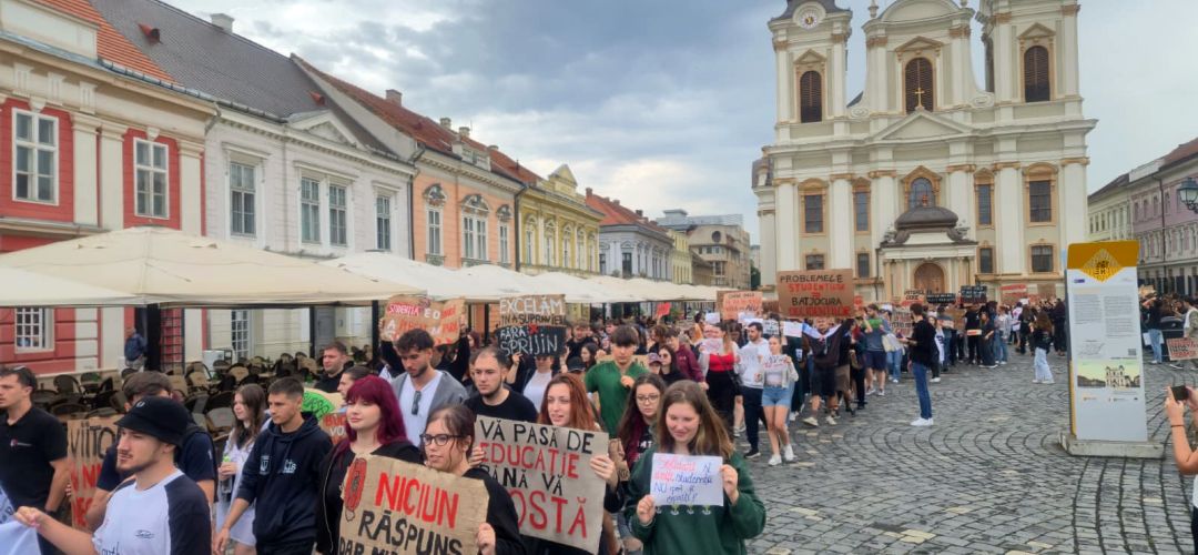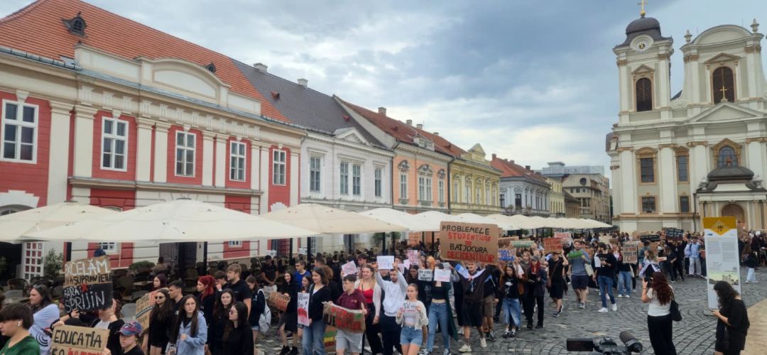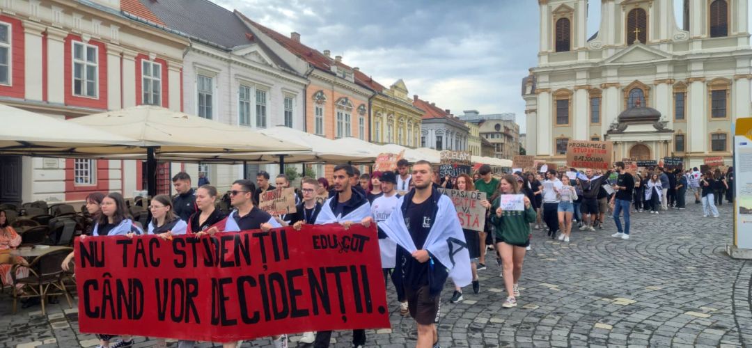 TIMIȘOARA. După ce duminică seară au organizat o acțiune de protest în Piața Victoriei, la Timișoara, luni studenții au mărșăluit prin oraș și își strigă nemulțumirile în piețele din centrul orasului.