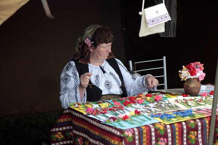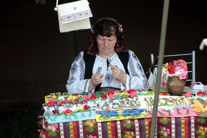 “Am venit cu flori impletite, e o tehnica speciala. Nu se fac din croseta, ci cu acul de cusut, dar tot impletite sunt. Am fragute, lacramioare, flori de camp si muscate, care sunt floarea traditionala a romanilor. Fiecare om ar trebui sa aiba in casa muscate, sunt frumoase si traditionale. Pe cele impletite le fac cu codite lungi. Cine vrea sa le poarte ca podoaba, le taie cozile si le prinde cu un ac. Cine le vrea de decor le poate pune chiar intr-o vaza mai mica” adauga o doamna.