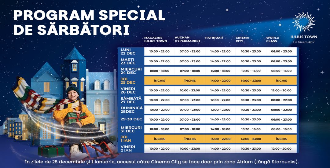 TIMISOARA. De sărbători, fiecare dintre noi își petrece timpul cu cei dragi și se bucură de momentele magice petrecute în familie. Iulius Town Timișoara are un special de sărbători încât să îți poți face ultimele cumpărături, dar și să te bucuri de experiențe. În prima zi de Crăciun și 1 ianuarie 2026, Cinema City și patinoarul din Iulius Gardens vor fi deschise.