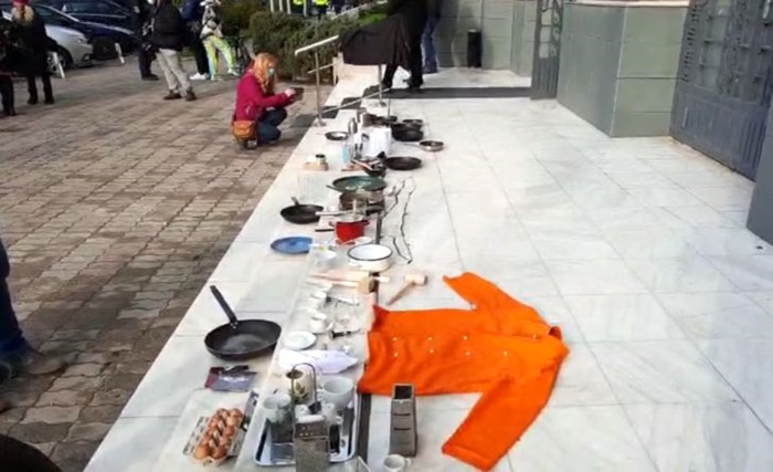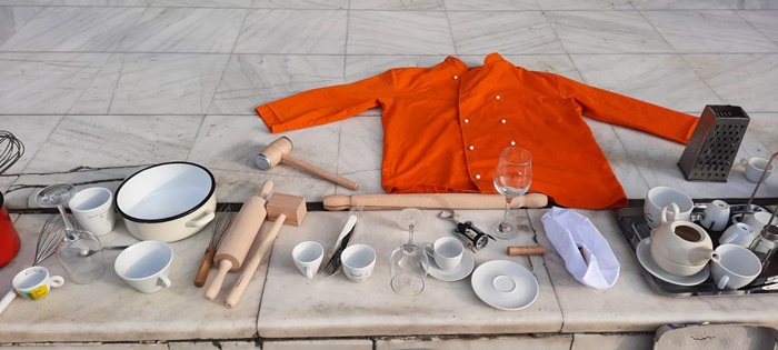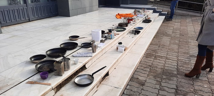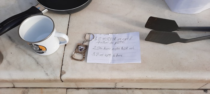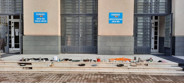 Pe rand, timp de 15 minute, mai multi ospatari, bucatari, barmani, dar si patroni de restaurante sau cafenele si baruri din Timisoara au trecut prin fata Prefecturii si au pus pe trepete un obiect pe care-l folsesc in activitatea zilnica.
