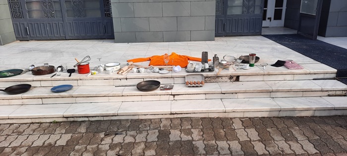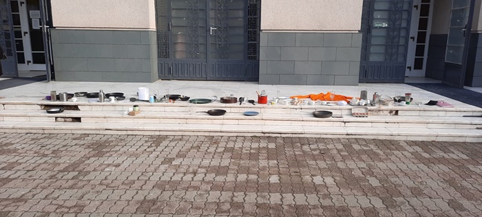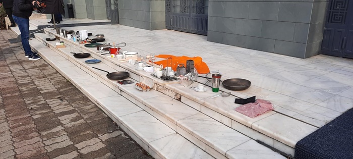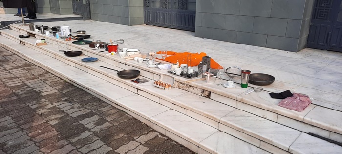 Mai multi angajati ai sectorului HORCA au asezat, vineri dimineata, pe scarile din fata sediului Prefecturii Timis obiectele pe care le folosesc in restaurante, baruri sau cafenele: cesti, pahare, oale, tavi, sorturi solnite sau tacamuri. Ei spun ca si-au predat ‘armele’ cu care si-ar fi putut ‘apara’ locurile de munca.