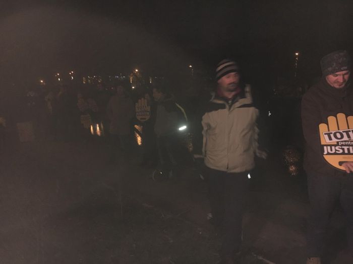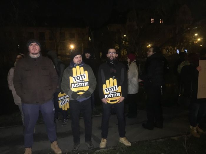 Este un protest spontan la care participa aproximativ 100 de oameni. Acestia poarta pancarte cu mesaje de sustinere a Justitiei cum ar fi “Toti pentru Justitie” si striga lozinci impotriva guvernantilor care pregatesc modificarea legilor Justitiei in Romania. S-au asezat pe trotuarul de vizavi de sediul de partid si stau cu fata spre cladire.