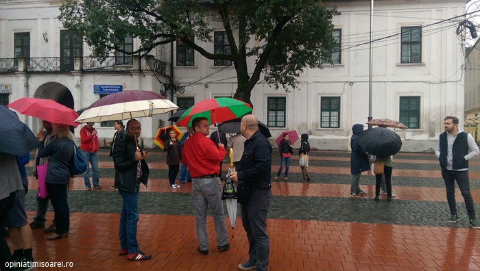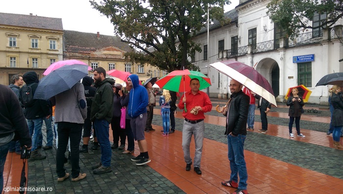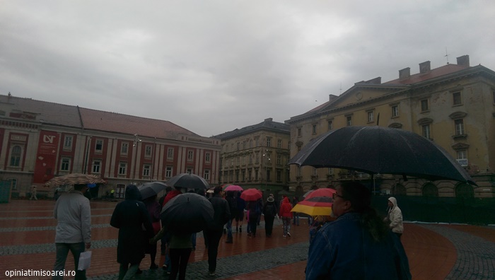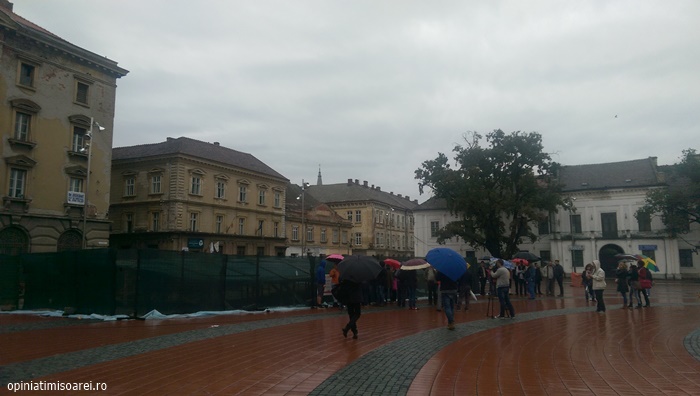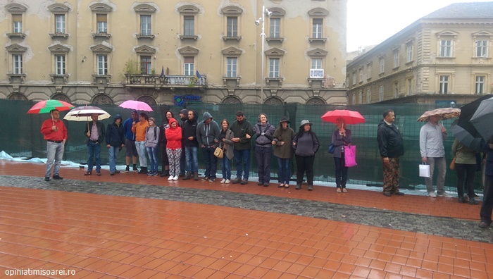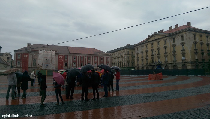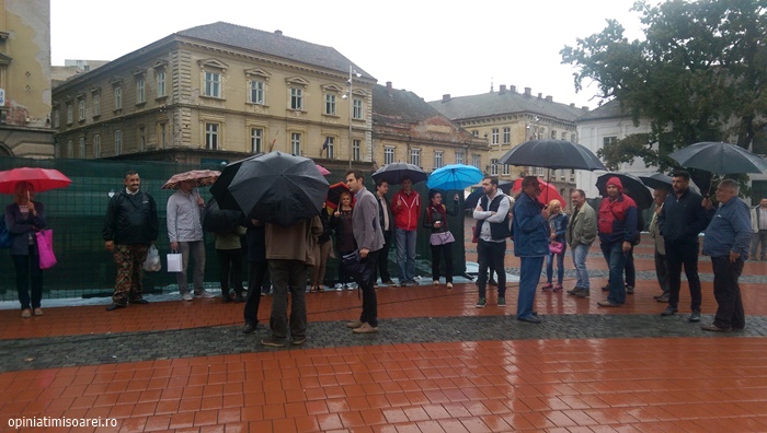 TIMISOARA. Aproximativ 50 de timisoreni care nu s-au speriat de ploaie au iesit sa protesteze fata de decizia de ingropare a Bailor turcesti scoase la iveala de arheologi in urma sapaturilor in centrul Timisoarei, pentru proiectul de realibilitare a zonei Cetate. Printre ei, arheologi, oameni de cultura, timisoreni simpli, nemti si directorul Muzeului Banatului.