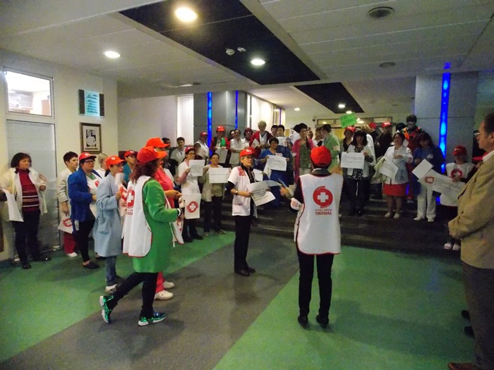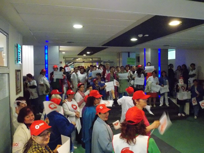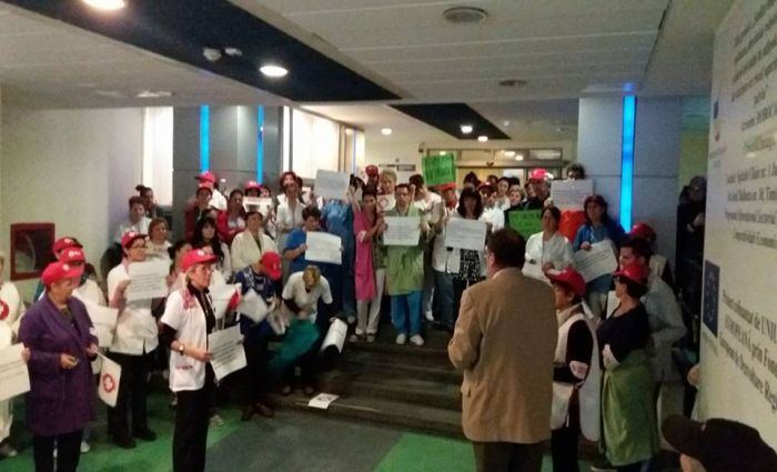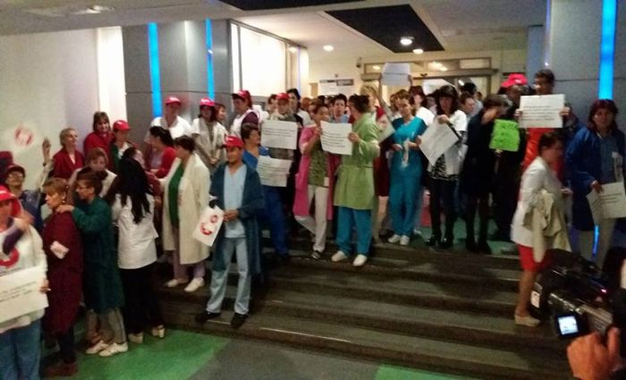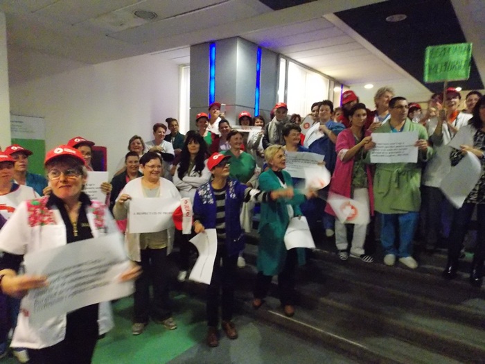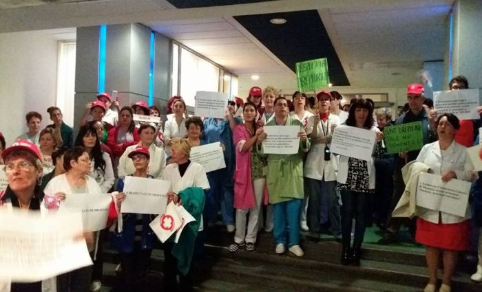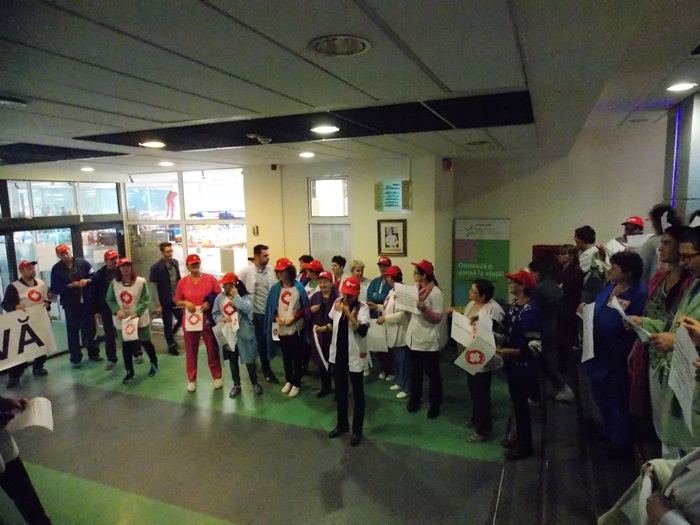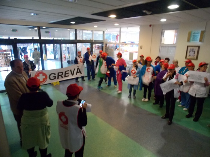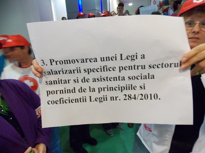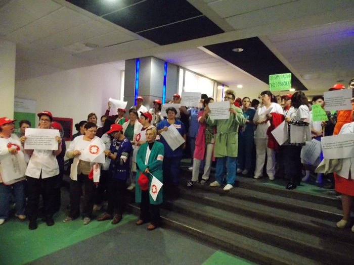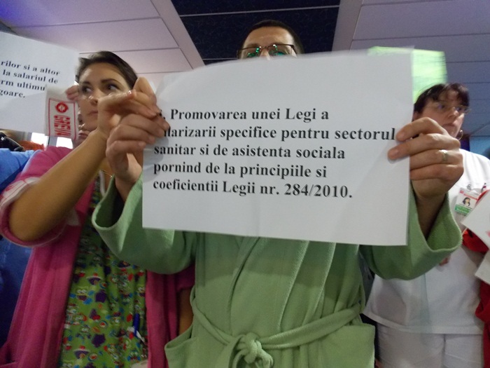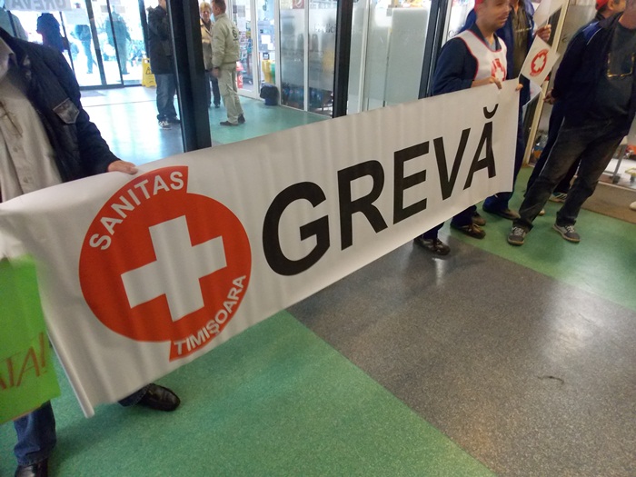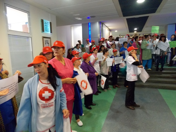 TIMISOARA. Asistentii medicali, personalul TESA si alti angajati din spitalele Judetean si Louis Turcanu care apartin sindicatului Sanitas si-au intrerupt programul de lucru si au iesit pe holurile unitatilor medicale sau in curte. Inarmati cu pancarte, protestatarii si-au strigat nemultumirile.