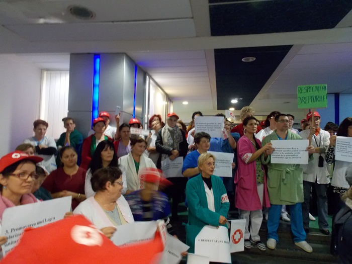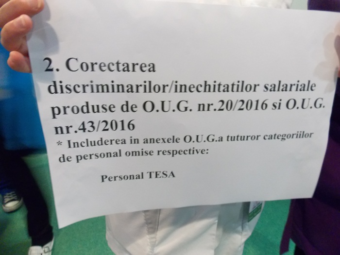 Sindicatul Sanitas cere introducerea in Ordonanta 20/2016 a angajatilor care lucreaza in serviciul tehnic administrativ, a functionarilor publici din Directiile de Sanatate Publica si a celor din crese si gradinite. Tocmai de aceea, toti cei vizati au iesit la protest sa-si caute dreptatea.