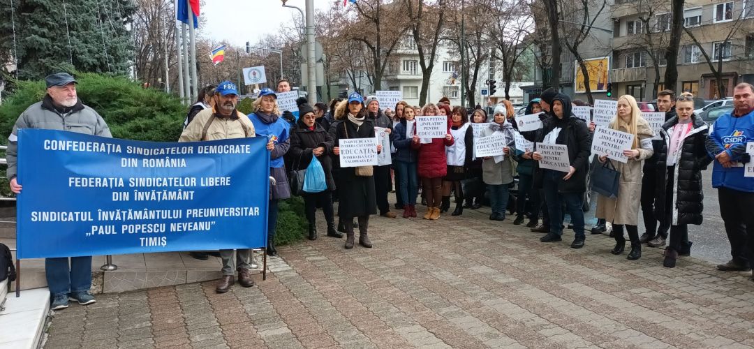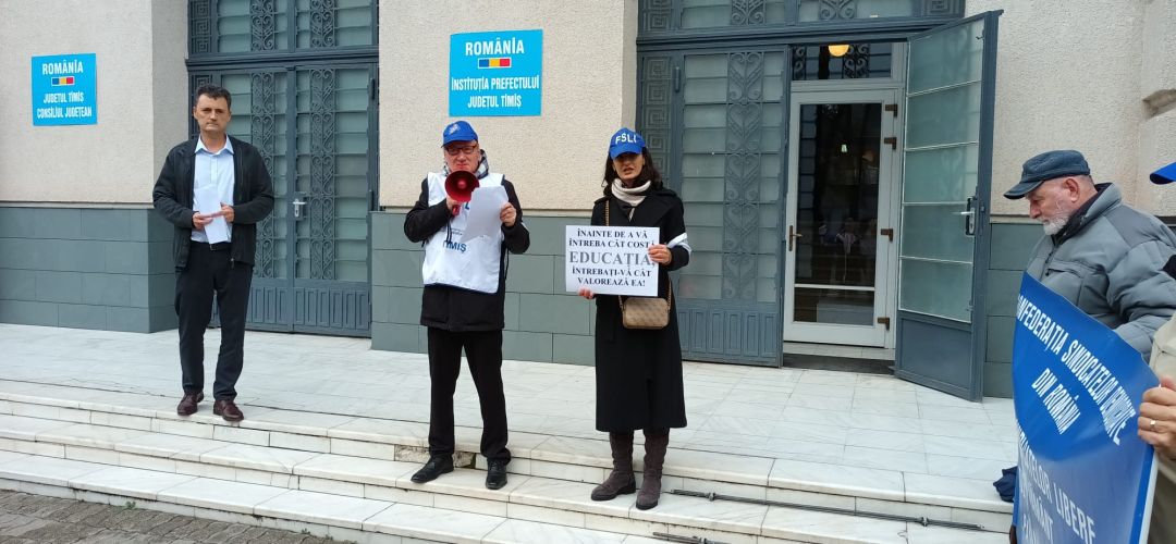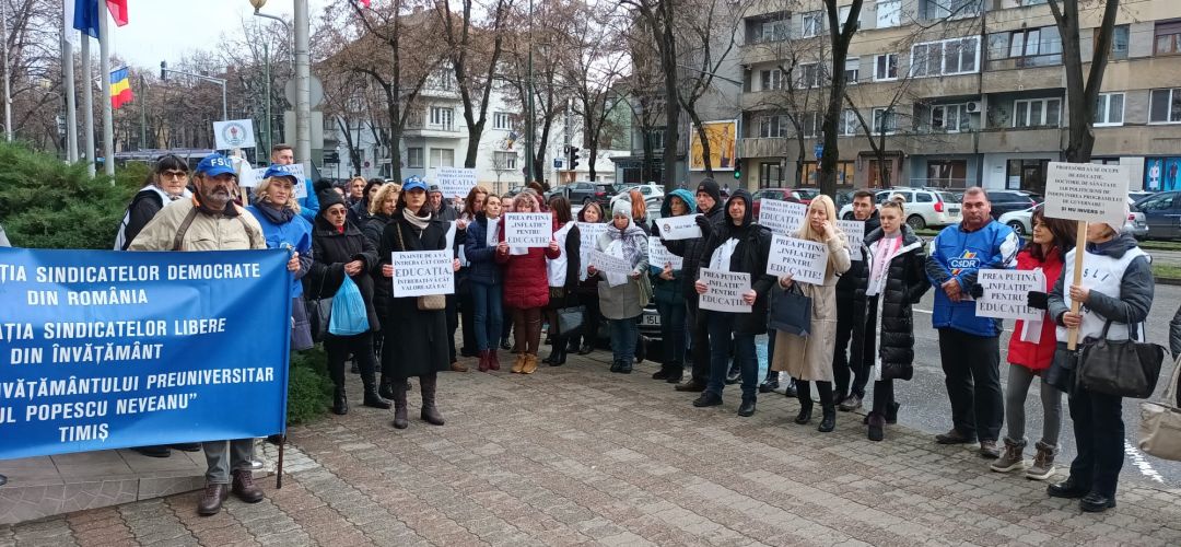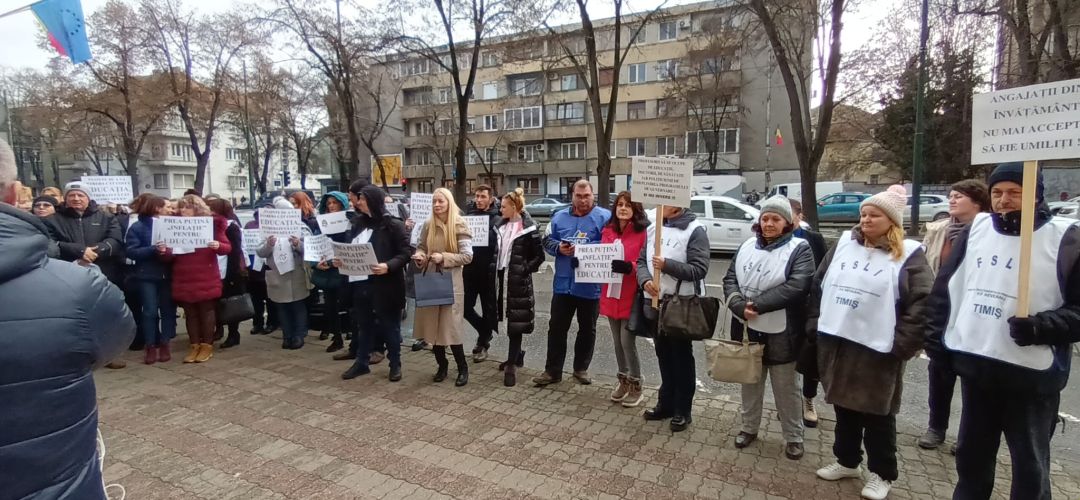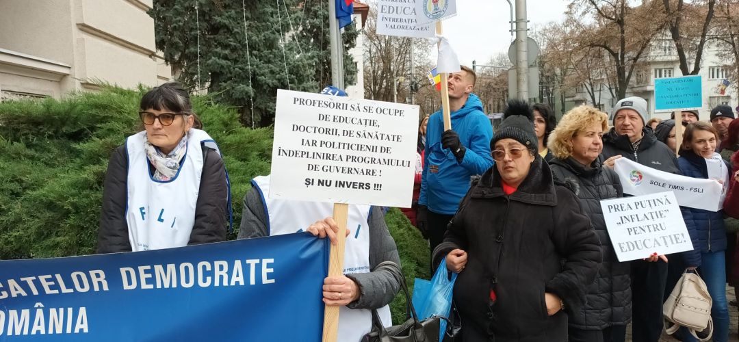 Profesorii s-au strans in fata Prefecturii Timis, unde au purtat si pancarte cu mesaje pentru guvernanti. “Prea putina ‘inflatie’ pentru educatie”, “Inainte de a va intreba cat costa educatia, intrebati-va cat valoreaza ea” sau “Voi cate zile puteti trai cu salariul unei ingrijitoare?” sunt doar cateva dintre mesajele afisate.
