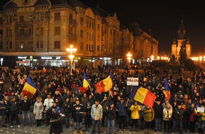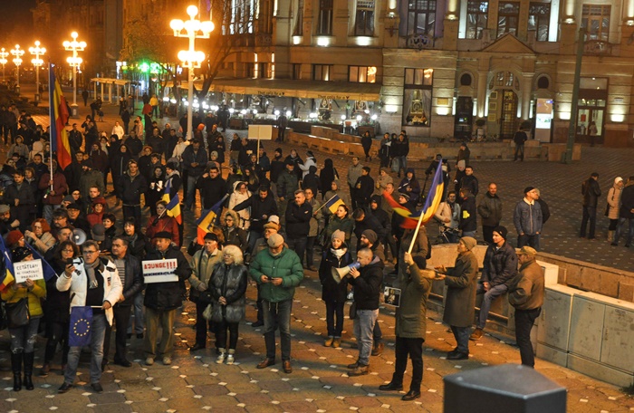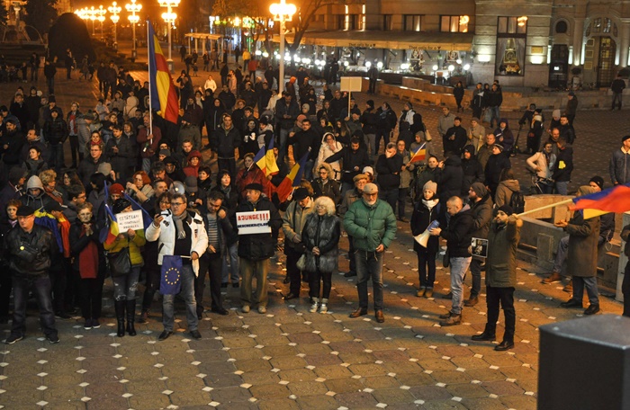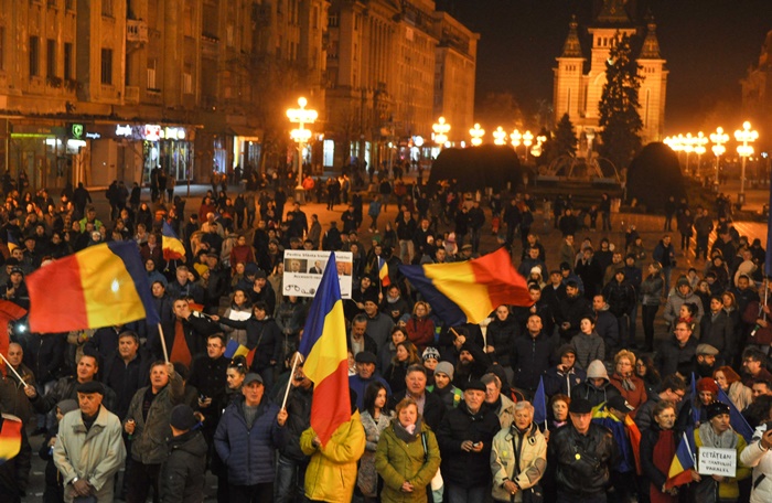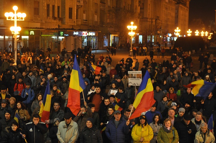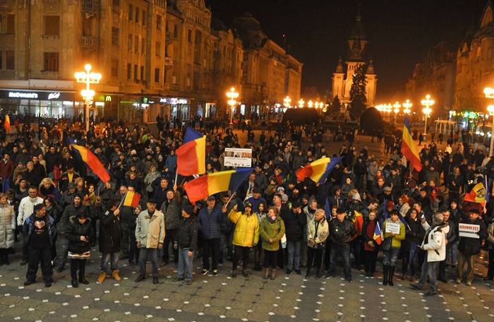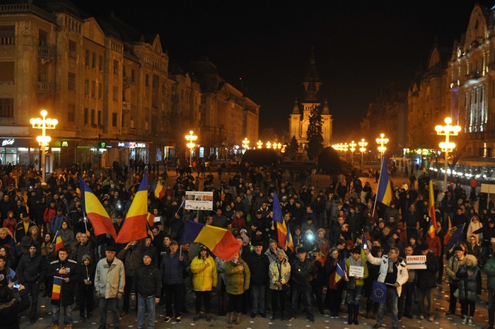 TIMISOARA. Timisorenii s-au intors duminica seara in Piata Victoriei pentru un nou protest. Oamenii au raspuns unui nou apel pe Facebook.