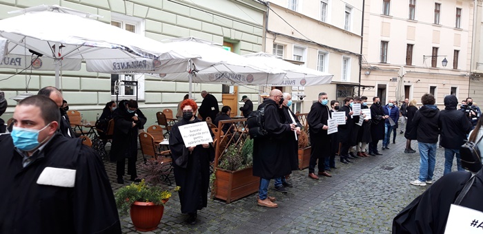 TIMISOARA. Zeci de avocati au iesit in strada miercuri la Timisoara pentru a protesta dupa ce Inalta Curte de Casatie si Justitie a motivat decizia in dosarul Ferma Baneasa, in care si un membru al Baroului Bucuresti a fost trimis in spatele gratiilor.