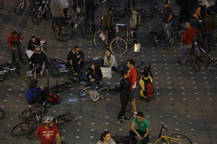 Intorsi pe platoul din Piata Operei, biciclistii s-au asezat pe jos pentru odihna, apoi au inceput sa se imprastie.