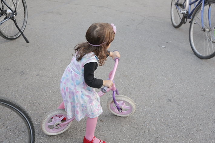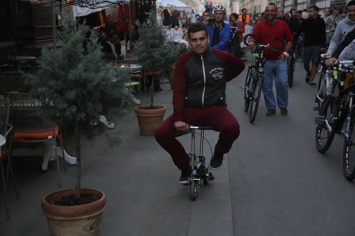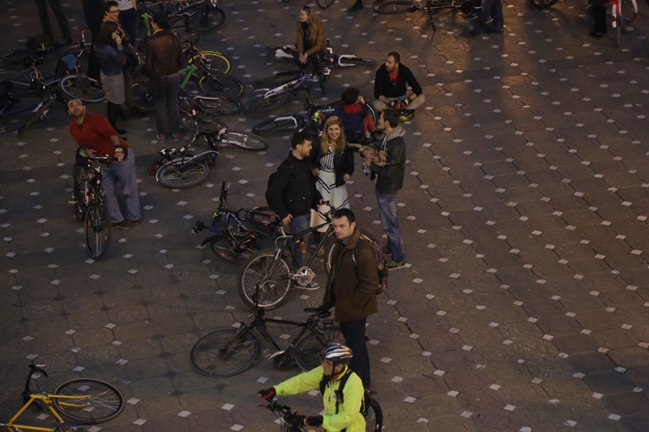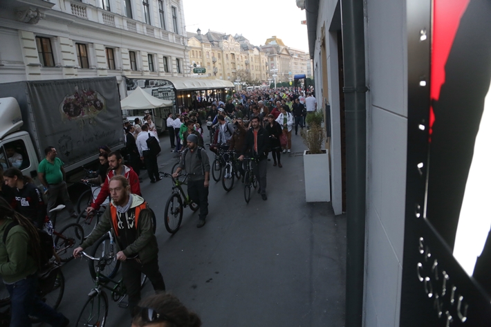 UPDATE: In sunet de claxoane, in jurul orei 18.45, protestatarii s-au incolonat si au pornit in plimbarea pe langa biciclete. Pentru a nu incurca pietonii, acestia au ales sa mearga pe o singura parte, pe langa terasele instalate pe mijlocul celor doua alei, Corso si Surogat, din Piata Victoriei.