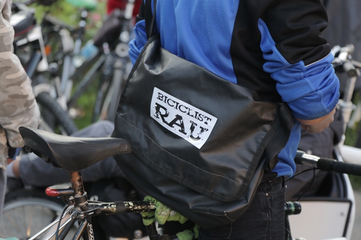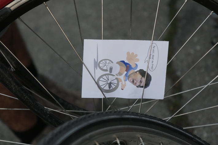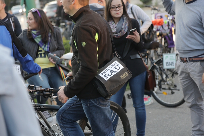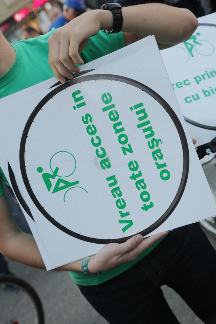 Participantii si-au confectionat afise pe care sta scris: “Sunt biciclist in Timisoara”, “Merg cu bicicleta la munca”, “Participant la traficul din Timisoara” si “Trec prin centru cu bicicleta”, iar unii au abtibilde cu “Biciclist rau”.