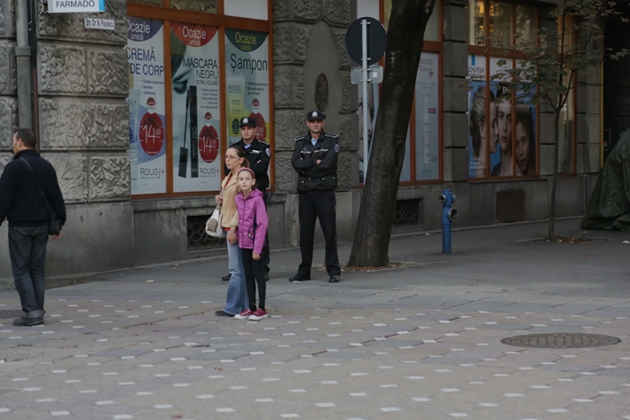 Politisti locali urmaresc de la distanta miscarea pentru a se asigura ca nimic nu va tulbura ordinea in centrul Timisoarei.