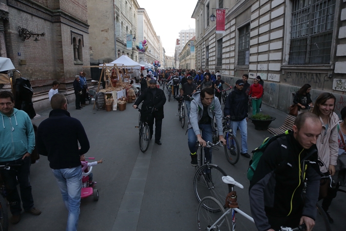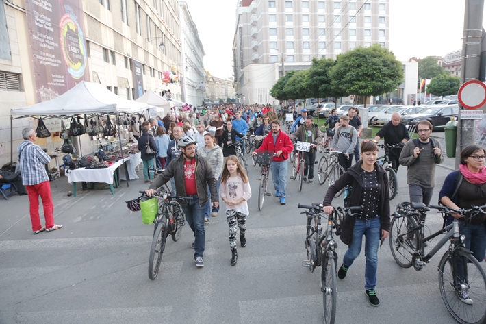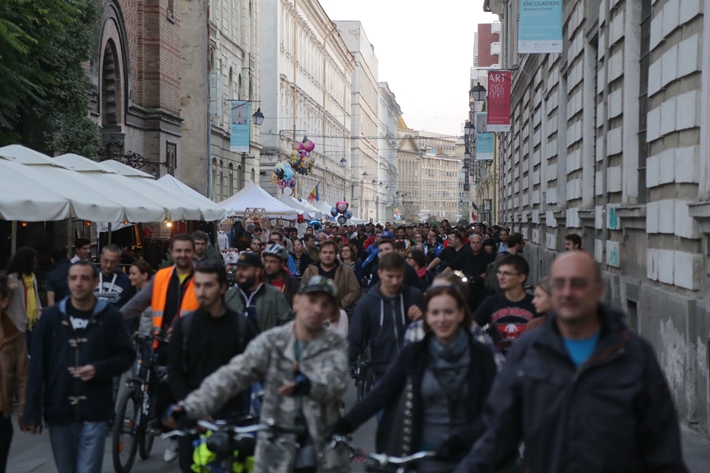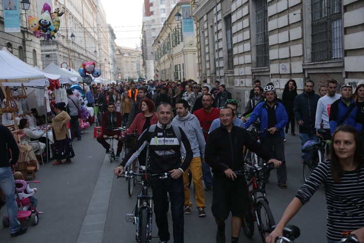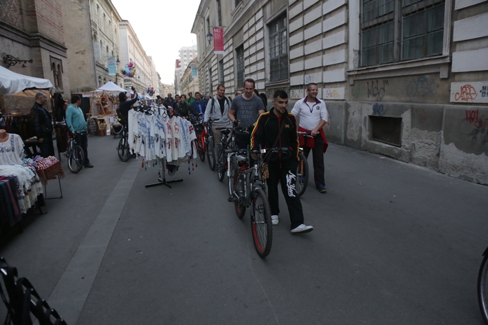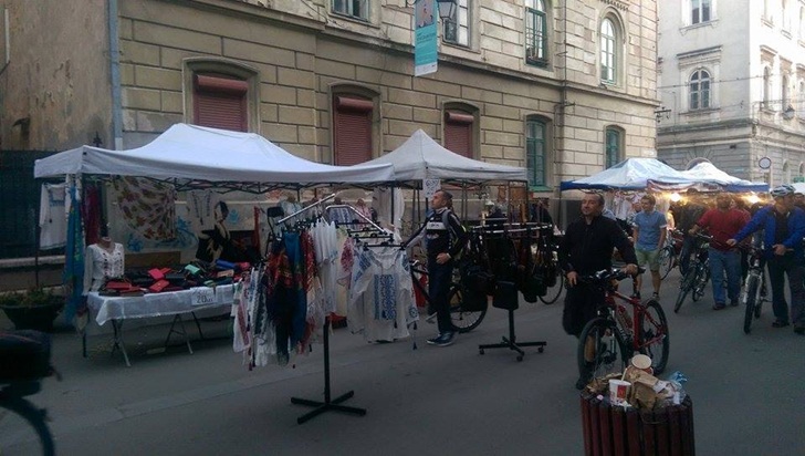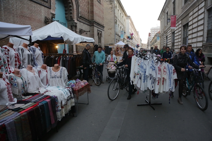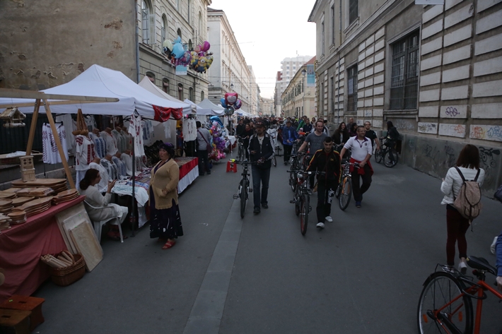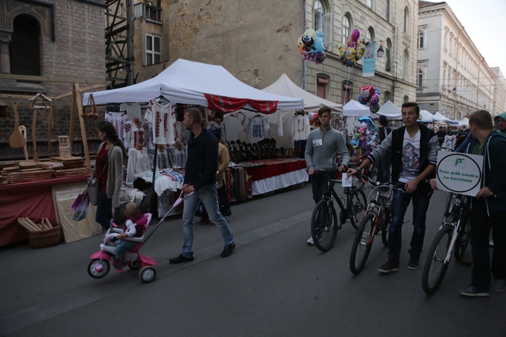 Pe faimoasa strada inchisa masinilor din centrul Timisoarei, biciclistii au avut de facut slalom printre tarabele unor comercianti ce primisera aprobare de la primarie pentru un targ cu produse asa-zis traditionale.