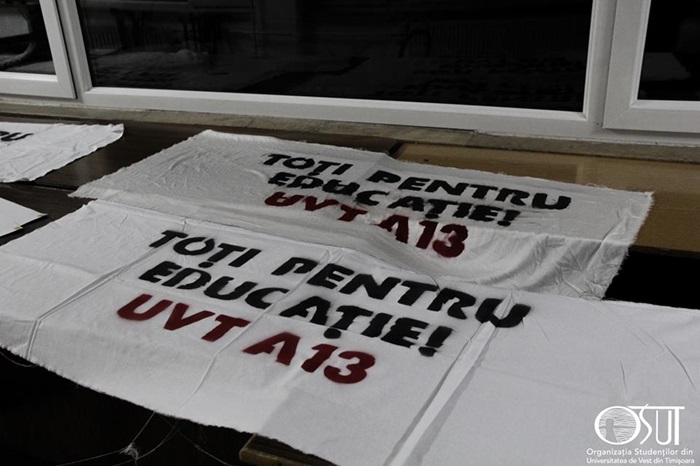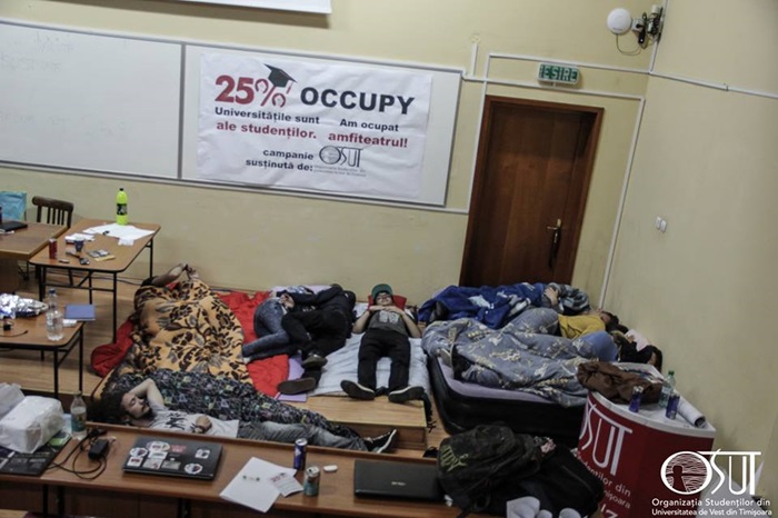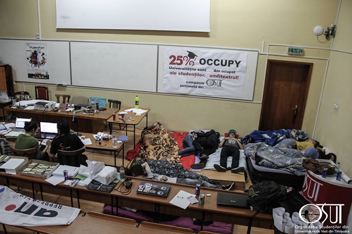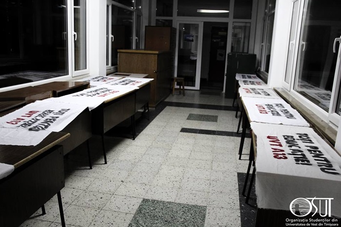 In a doua noapte de protest la Timisoara, studentii s-au inchis din nou in amfiteatru, unde au dezbatut problemele sistemului universitar romanesc. Ei refuza sa paraseasca universitatea pana cand revendicarile lor nu vor fi solutionate.