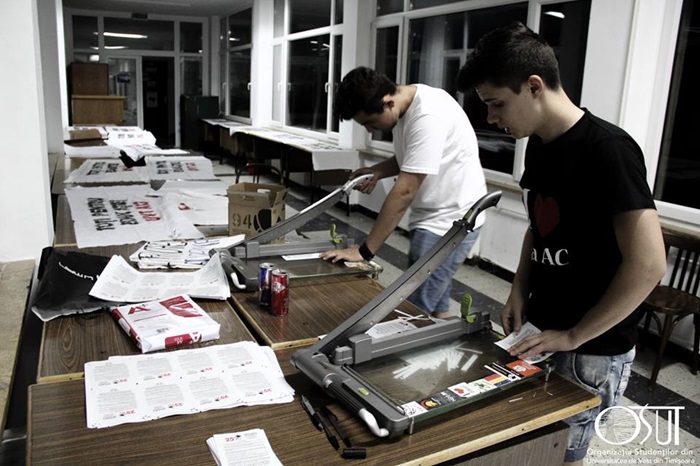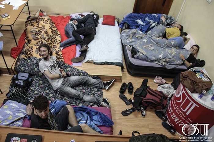 “Azi-noapte am avut o dezbatere pe tema subfinantarii educatiei, pe care am terminat-o pe la 22. Apoi, am trecut la o discutie organizatorica in cadrul careia am vorbit despre ce vom face in continuare. Am terminat tarziu, in noapte. Ne-am impartit pe echipe si am discutat fiecare ce are de facut, dupa care fiecare echipa a inceput sa lucreze la bannere pentru actiunea de astazi, sageti care vor fi puse peste tot si care vor conduce spre amfiteatru, afise care vor fi puse prin camine. La ora 12 o sa mergem cu autobuzul si o sa facem un tur al orasului si o sa lasam bannere la universitati. Sunt incantat ca s-a dublat numarul studentilor fata de seara trecuta. La dezbatere au participat 100, iar pana dimineata au ramas 30 de persoane care n-au inchis un ochi”, a declarat pentru opiniatimisoarei.ro Vlad Chereches, vicepresedinte educational ANOSR.