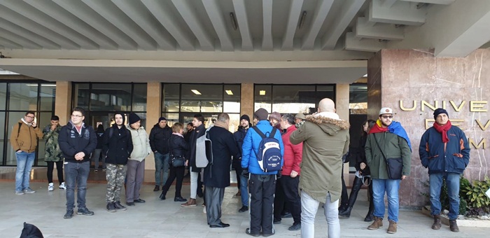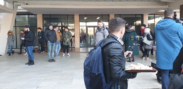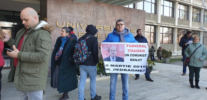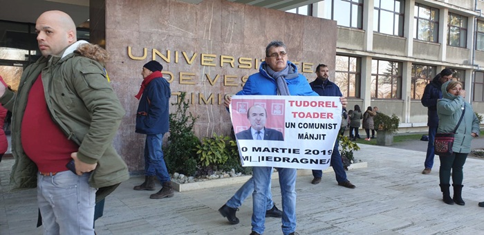 In fata intrarii de la Universitatea de Vest, unde era programata intalnirea, si-au facut aparitia si 20 de timisoreni dornici sa-l intampine pe ministru… asa cum se cuvine, spuneau ei.